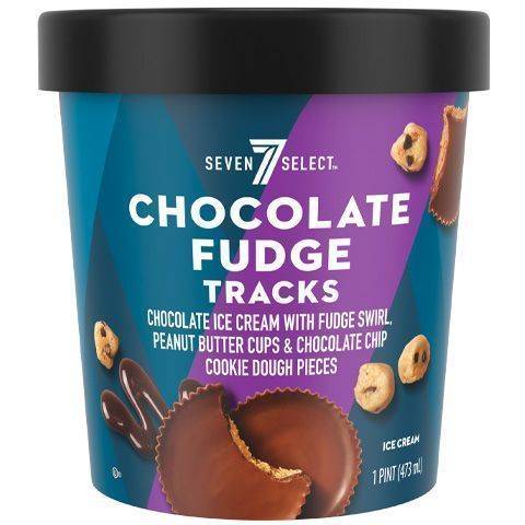 Indulge in a creamy chocolate ice cream enriched with a decadent fudge swirl, complemented by the addition of mini peanut butter cups and chunks of chocolate chip cookie dough for a delightful textural contrast. • Brand: 7-select • Flavor: Chocolate fudge tracks
