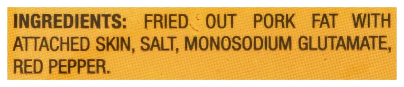 Ingredients: Fried Out Pork Fat with Attached Skin, Salt, Monosodium Glutamate, Red Pepper