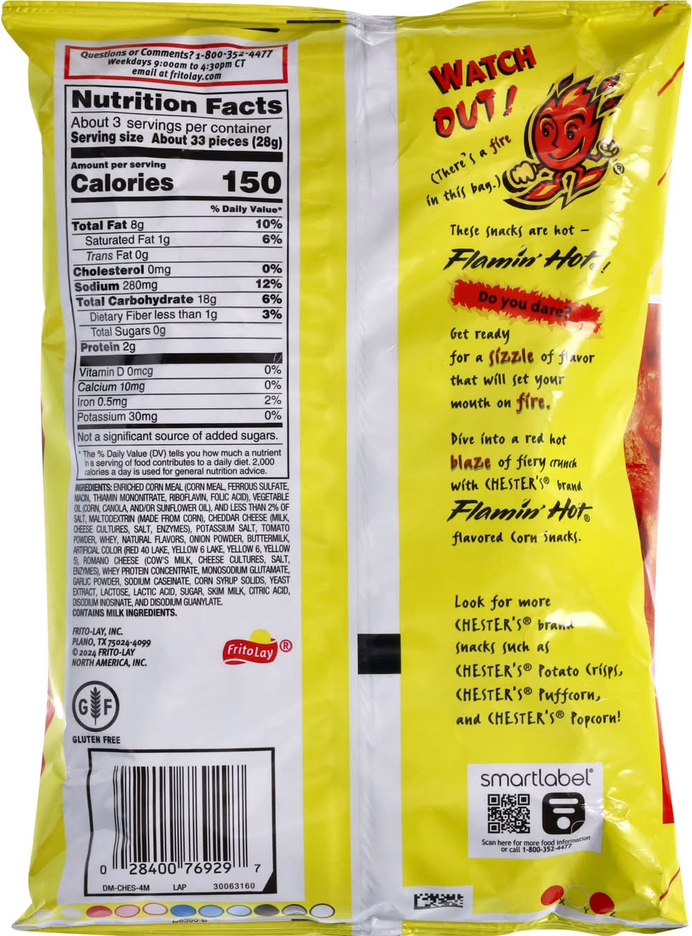 Explosion of crunch and serious heat. • Brand: Chester's • Flavor: Flamin' hot • gluten-free