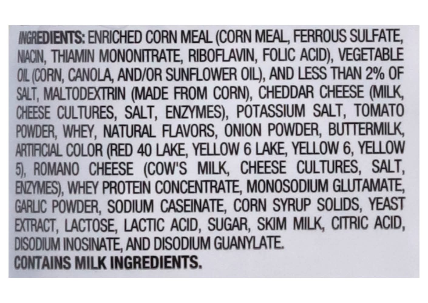 Ingredients: Enriched Corn Meal (Corn Meal, Ferrous Sulfate, Niacin, Thiamin Mononitrate, Riboflavin, Folic Acid), Vegetable Oil (Corn, Canola, and/or Sunflower Oil), and Less than 2% of Salt, Maltodextrin (Made from Corn), Cheddar Cheese (Milk, Cheese Cultures, Salt, Enzymes), Potassium Salt, Tomato Powder, Whey, Natural Flavors, Onion Powder, Buttermilk, Artificial Color (Red 40 Lake, Yellow 6 Lake, Yellow 6, Yellow 5), Romano Cheese (Cow's Milk, Cheese Cultures, Salt, Enzymes), Whey Protein Concentrate, Monosodium Glutamate, Garlic Powder, Sodium Caseinate, Corn Syrup Solids, Yeast Extract, Lactose, Lactic Acid, Sugar, Skim Milk, Citric Acid, Disodium Inosinate, and Disodium Guanylate Contains: Milk, Lactose