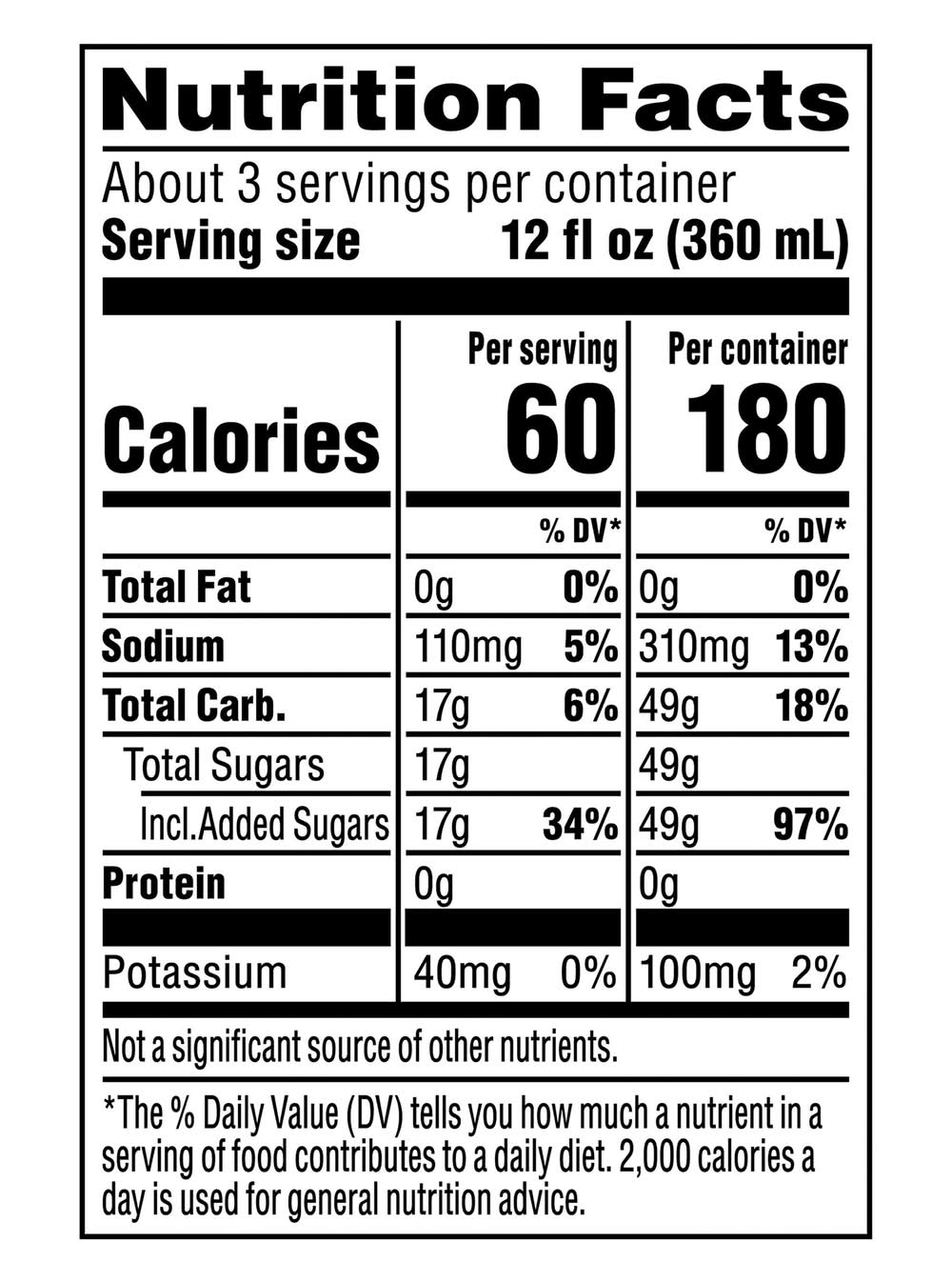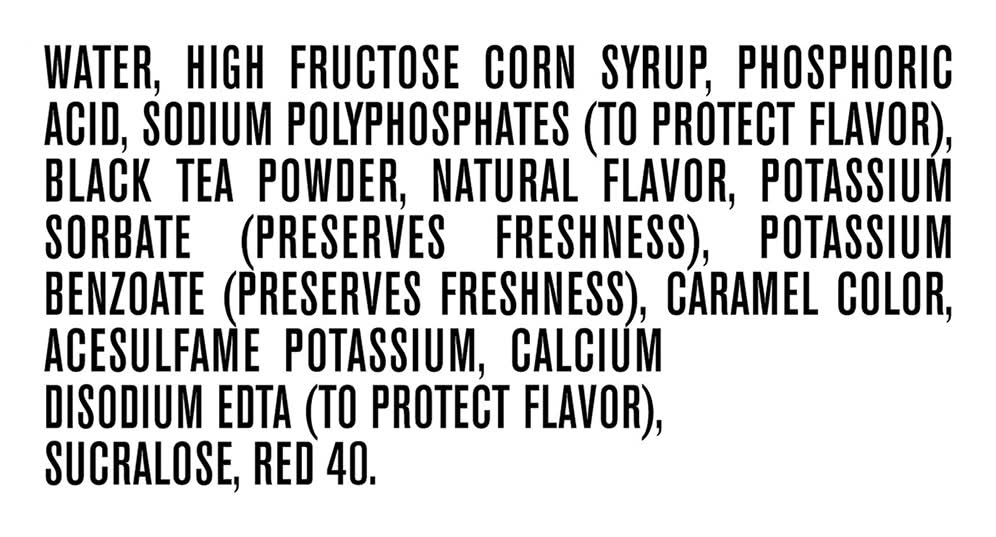 Ingredients: Water, High Fructose Corn Syrup, Phosphoric Acid, Sodium Polyphosphates (to Protect Flavor), Black Tea Powder, Natural Flavor, Potassium Sorbate (Preserves Freshness), Potassium Benzoate (Preserves Freshness), Caramel Color, Acesulfame Potassium, Calcium Disodium EDTA (to Protect Flavor), Sucralose, Red 40