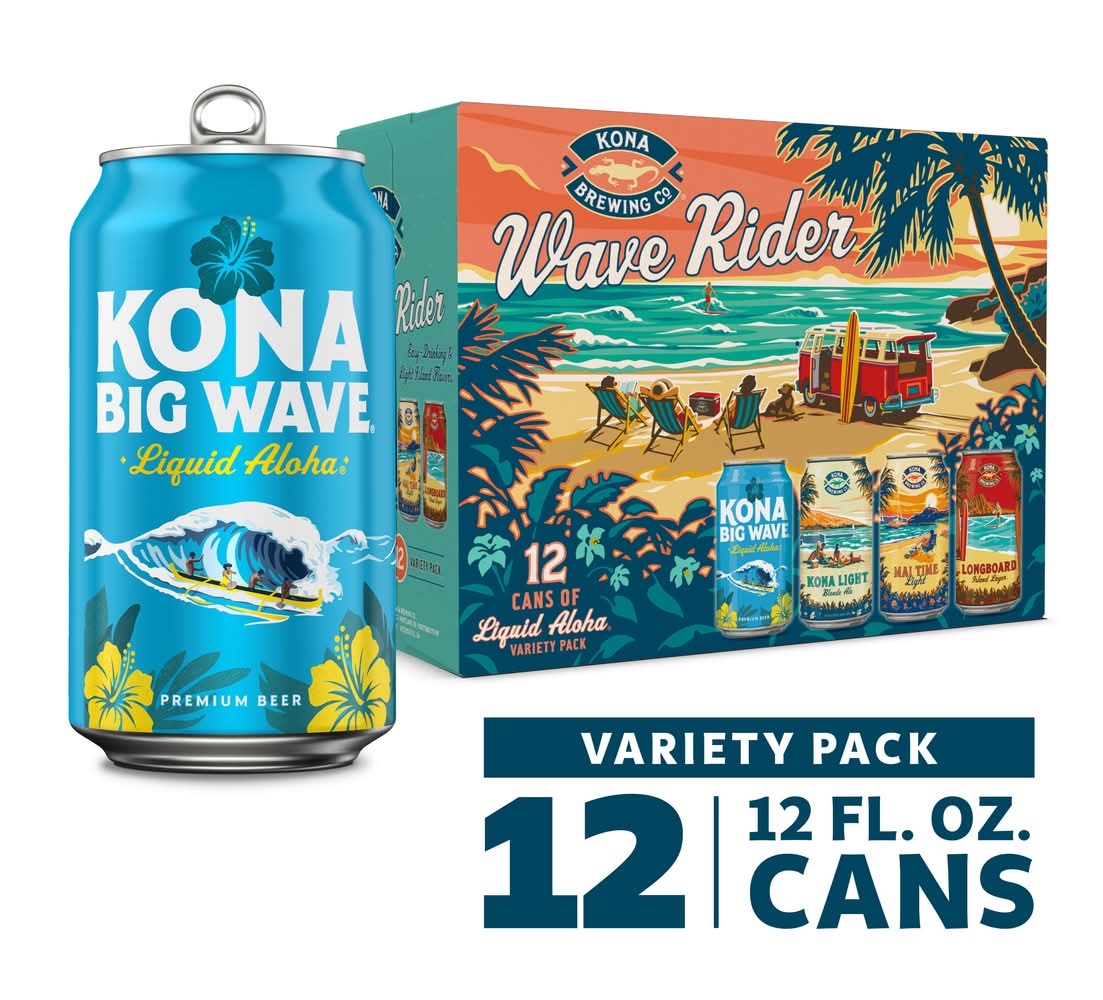 Variety Pack offers a selection of island-inspired beers, each with its own unique flavor profile. Included in the pack are Big Wave Golden Ale, Kona Light Blonde Ale, Mai Time Light, and Longboard Island Lager. The variety pack features beer brewed with a blend of pineapple, orange, and lime, providing a taste of the islands with added natural flavors. Two of the beers in the assortment are light beers, and one ale in the selection is infused with tropical mango. Alcohol content varies among the selections with Big Wave Golden Ale at 4.4%, Kona Light Blonde Ale at 4.2%, Mai Time Light at 4%, and Longboard Island Lager at 4.6%. These beers are crafted to offer an easy-drinking experience reminiscent of Hawaii's relaxing and lush atmosphere. • Brand: Kona brewing co. • Category: Variety pack beer • Pack size: 12 • Alcohol by volume: 4.3% • Packaging: Reusable