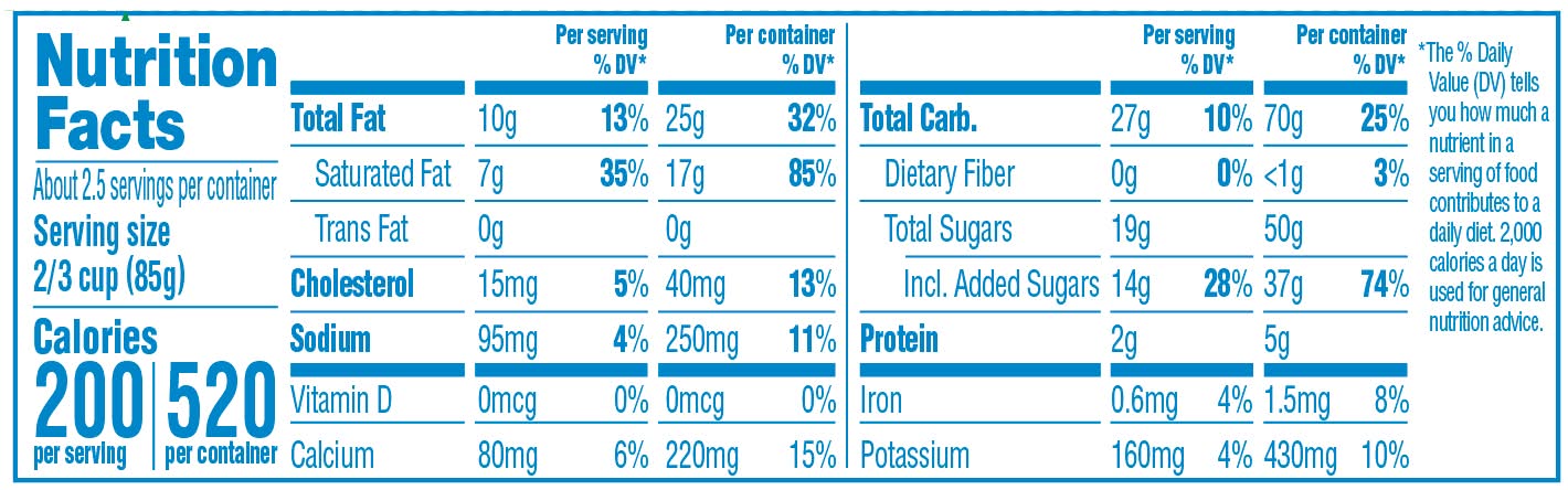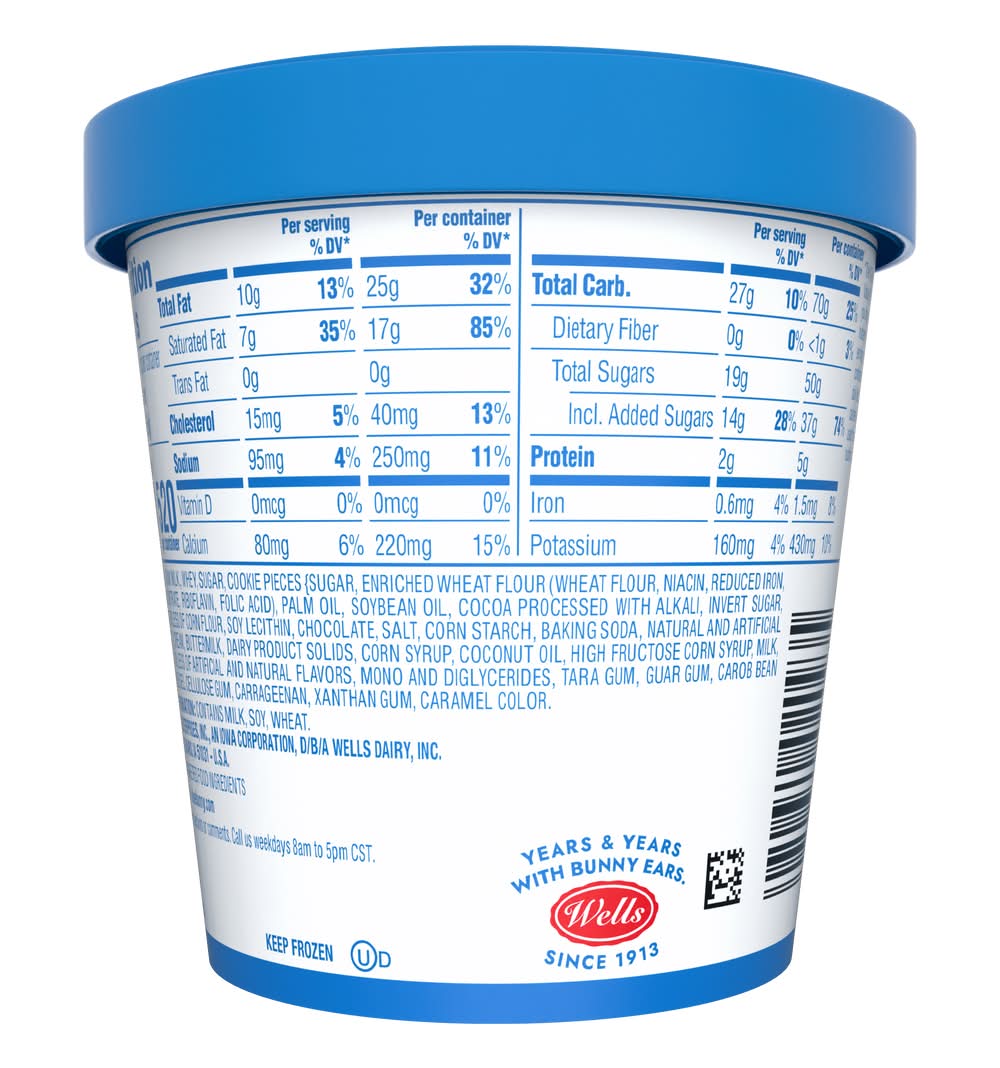 Ingredients: Skim Milk, Whey, Sugar, Cookie Pieces {Sugar, Enriched Wheat Flour (Wheat Flour, Niacin, Reduced Iron, Thiamin Mononitrate, Riboflavin, Folic Acid), Palm Oil, Soybean Oil, Cocoa Processed with Alkali, Invert Sugar, Contains 2% or less of Corn Flour, Soy Lecithin, Chocolate, Salt, Corn Starch, Baking Soda, Natural and Artificial Flavor, Whey}, Cream, Buttermilk, Dairy Product Solids, Corn Syrup, Coconut Oil, High Fructose Corn Syrup, Milk, Contains 1% or less of Artificial and Natural Flavors, Mono and Diglycerides, Tara Gum, Guar Gum, Carob Bean Gum, Cellulose Gel, Cellulose Gum, Carrageenan, Xanthan Gum, Caramel Color. Contains: Contains Milk, Soy, Wheat.