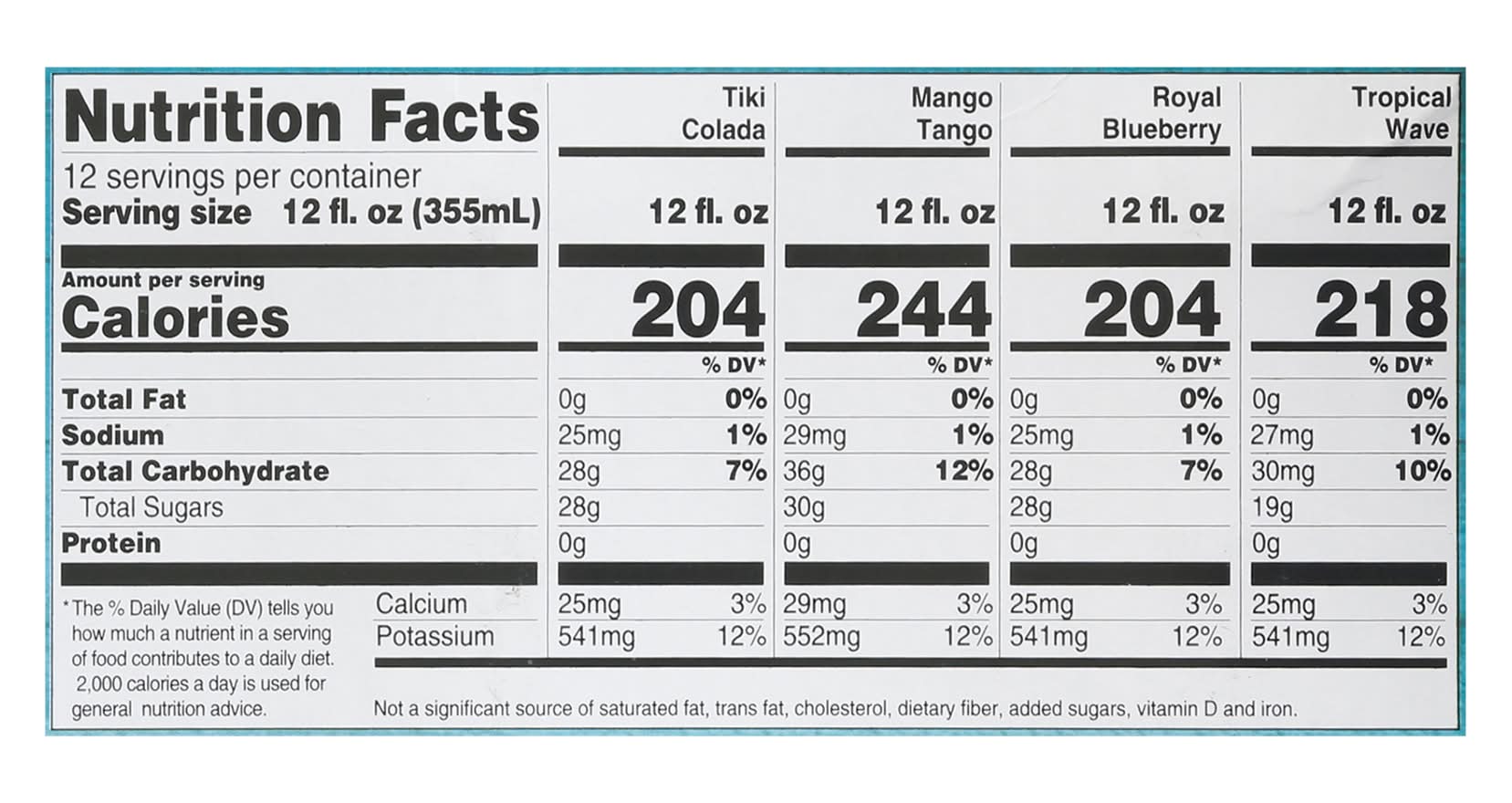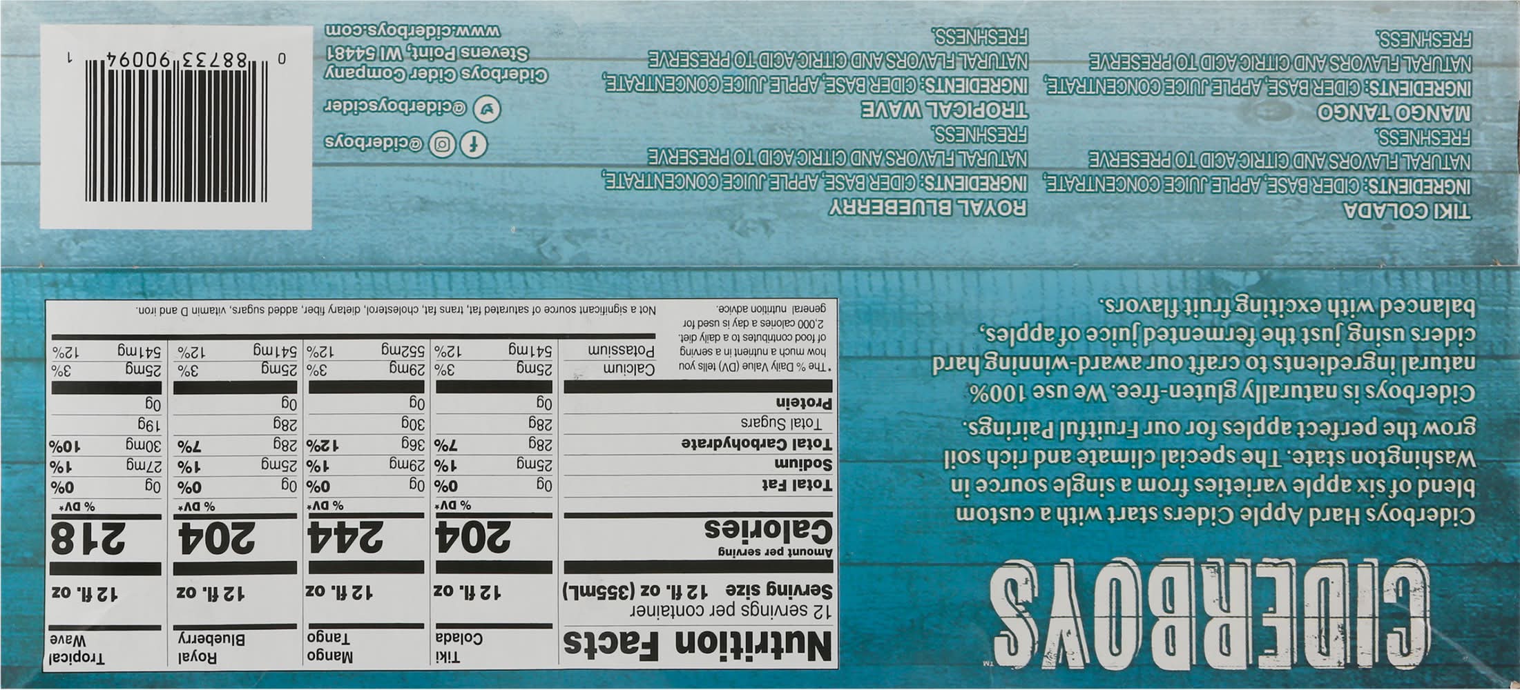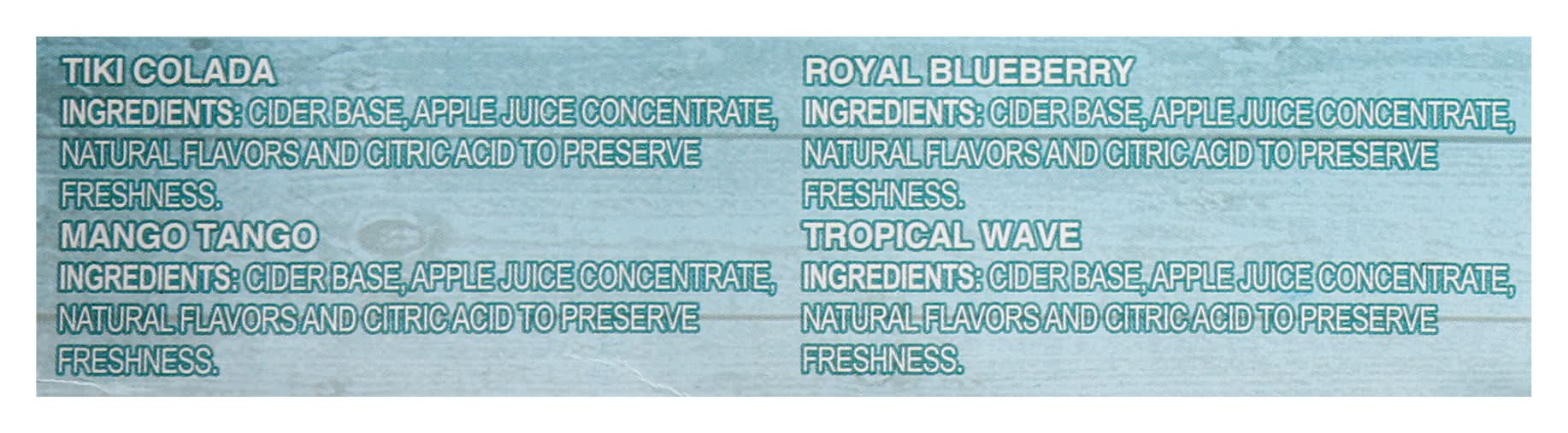 Ingredients: Tiki Colada: Cider Base, Apple Juice Concentrate, Natural Flavors And Citric Acid to Preserve Freshness. Mango Tango: Cider Base, Apple Juice Concentrate, Natural Flavors And Citric Acid to Preserve Freshness. Tropical Wave: Cider Base, Apple Juice Concentrate, Natural Flavors And Citric Acid to Preserve Freshness. Royal Blueberry: Cider Base, Apple Juice Concentrate, Natural Flavors And Citric Acid to Preserve Freshness