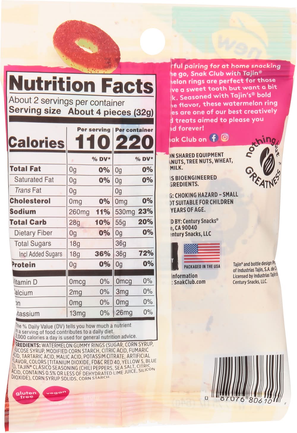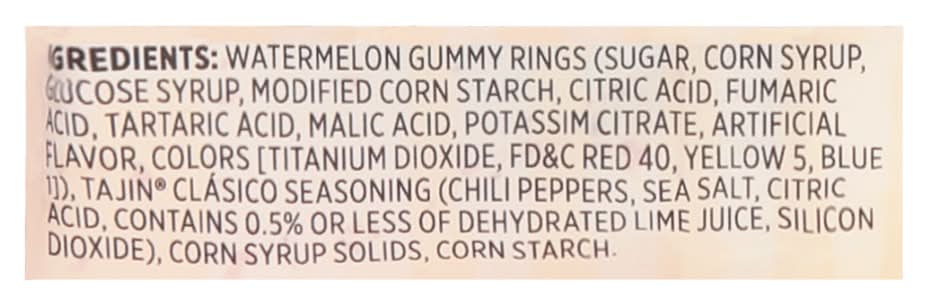 Ingredients: Watermelon Gummy Rings (Sugar, Corn Syrup, Glucose Syrup, Modified Corn Starch, Citric Acid, Fumaric Acid, Tartaric Acid, Malic Acid, Potassium Citrate, Artificial Flavor, Colors [Titanium Dioxide, FD&C Red 40, Yellow 5, Blue 1]), Tajin Clasico Seasoning (Chili Peppers, Sea Salt, Citric Acid, Contains 0.5% or Less of Dehydrated Lime Juice, Silicon Dioxide), Corn Syrup Solids, Corn Starch Contains: Corn, Peanuts, Tree Nuts, Wheat, Soybeans, Milk