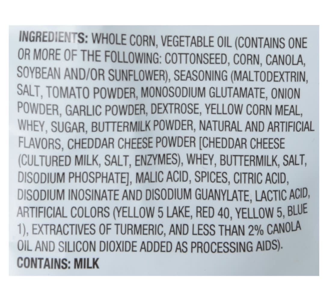 Ingredients: Whole Corn, Vegetable Oil (Contains One or More of the Following: Cottonseed, Corn, Canola, Soybean, and/or Sunflower), Seasoning (Maltodextrin, Salt, Tomato Powder, Monosodium Glutamate, Onion Powder, Garlic Powder, Dextrose, Yellow Corn Meal, Whey, Sugar, Buttermilk Powder, Natural and Artificial Flavors, Cheddar Cheese Powder [Cheddar Cheese (Cultured Milk, Salt, Enzymes), Whey, Buttermilk, Salt, Disodium Phosphate], Malic Acid, Spices, Citric Acid, Disodium Inosinate and Disodium Guanylate, Lactic Acid, Artificial Colors [Yellow 5 Lake, Red 40, Yellow 5, Blue 1), Extractives of Turmeric, and Less than 2% Canola Oil and Silicon Dioxide Added as Processing Aids) Contains: Corn, Milk, Soybeans