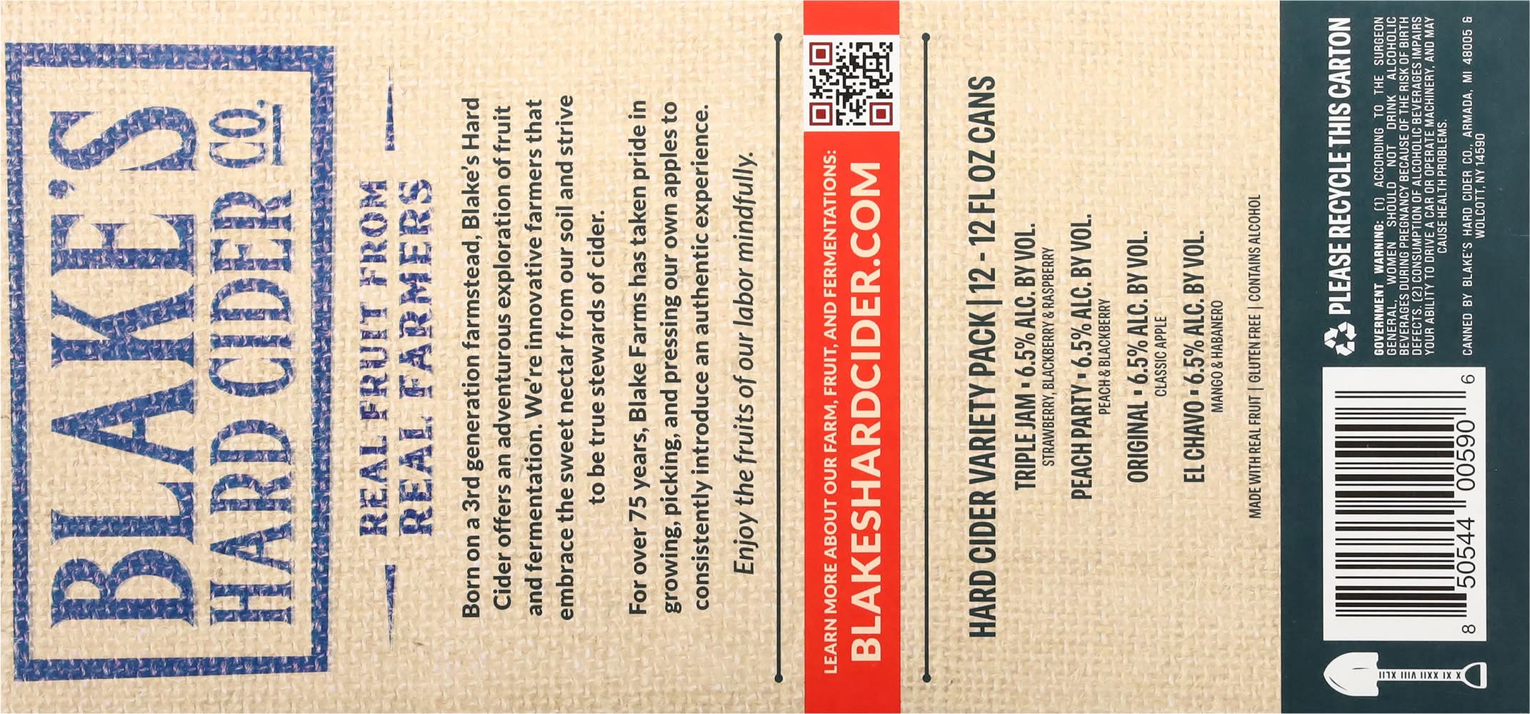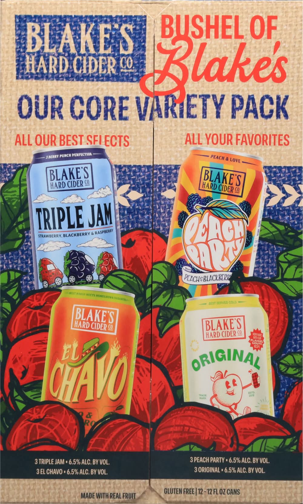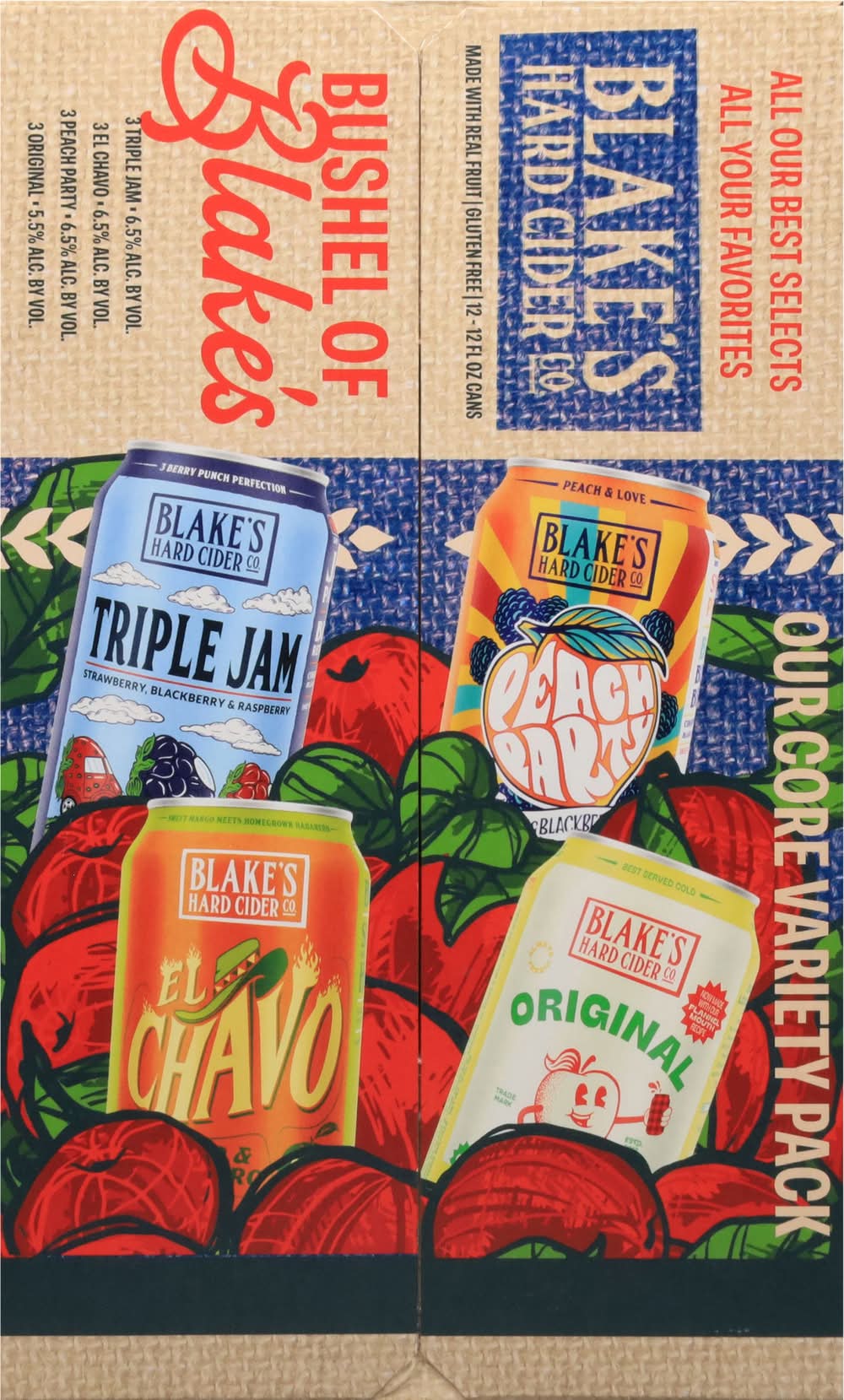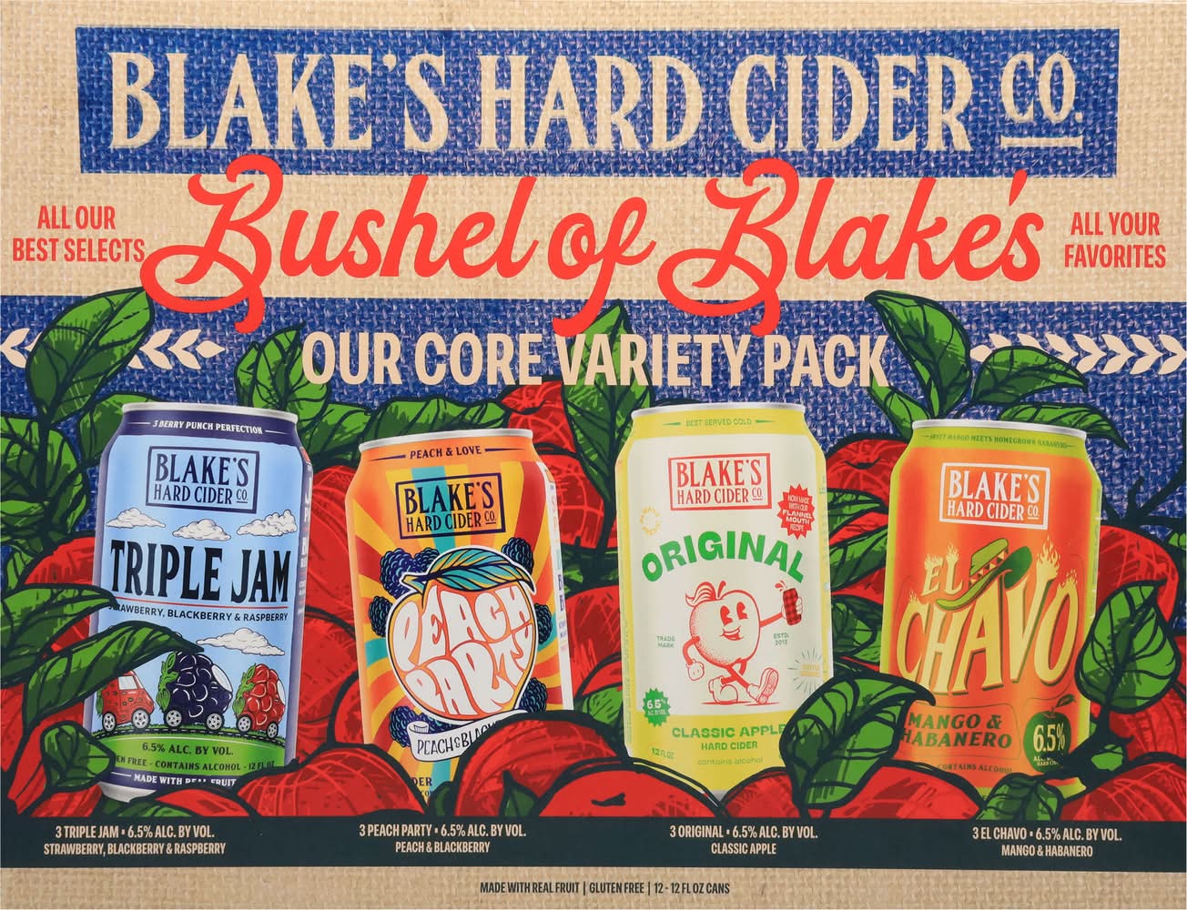 Hard Cider, Bushel of Blake's, Variety Pack • Flavor: Assorted • Pack size: 12 • Alcohol by volume: 6.5% • Packaging: Reusable