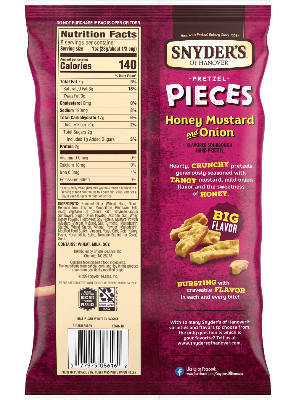 Snyder's of Hanover Honey Mustard and Onion Pretzel Pieces are bursting with craveable flavor in every bite! Enjoy crunchy sourdough pretzels, generously seasoned with tangy mustard, mild onion flavor, and the sweetness of honey. You'll love the crunch, hearty satisfaction, and bold flavor found in every bite. Our pretzel pieces are the perfect snack to crunch on during game day or as a lunchtime side. Snyder's of Hanover has been America's Pretzel Bakery since 1909, and our pretzels give you that delicious crunch for the perfect snack! Made in a facility that does not process peanuts, Snyder's pretzels are made from wholesome ingredients, kneaded, and oven baked to seal in all the flavor. Snyder's of Hanover pretzels have been shared across tables, across generations, and across the country, making us America's favorite pretzel brand. There’s nothing like the bold flavor of honey mustard and onion, and with an 8-oz. bag, it’s easy to feed your craving any time. • Number of servings: 8 • Packaging: Reusable