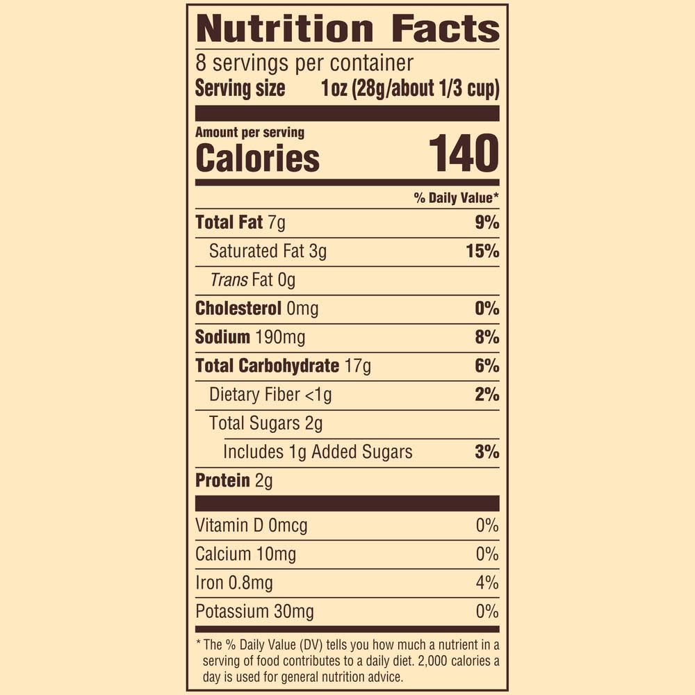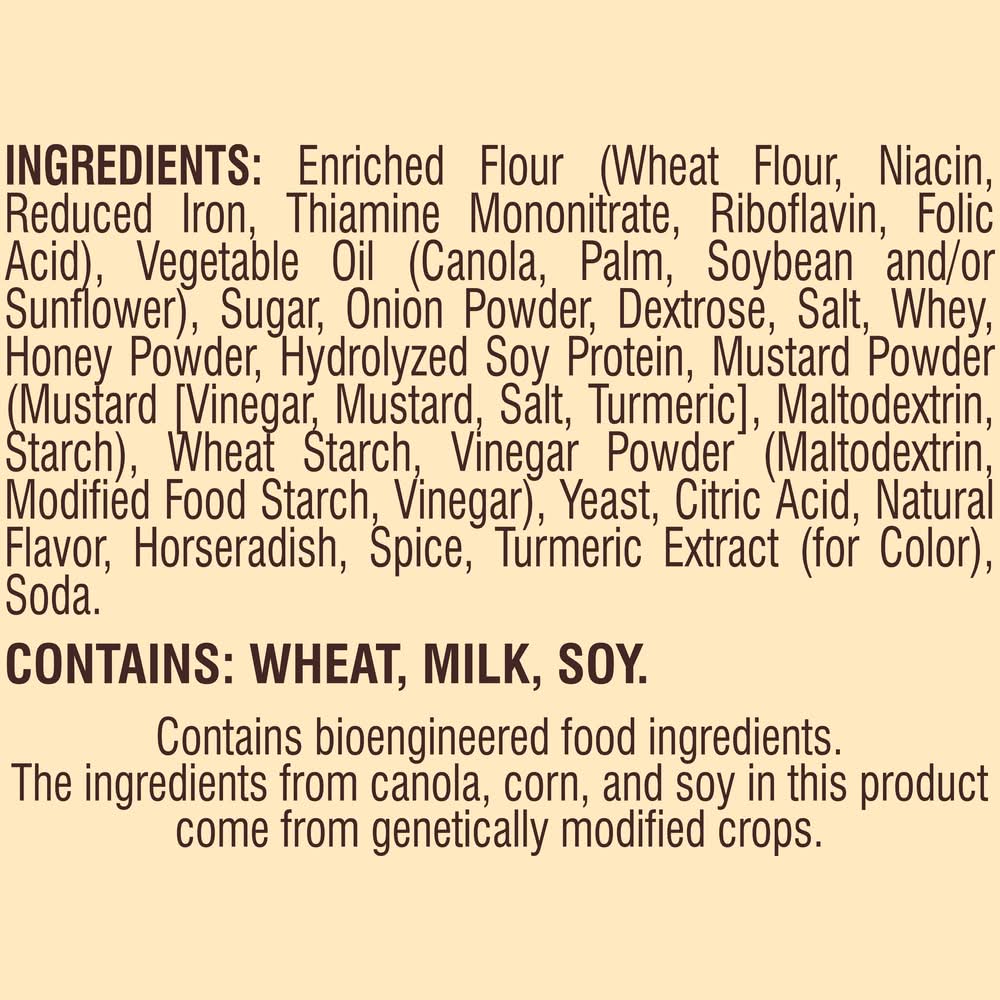 Ingredients: INGREDIENTS: ENRICHED FLOUR (WHEAT FLOUR, NIACIN, REDUCED IRON, THIAMINE MONONITRATE, RIBOFLAVIN, FOLIC ACID), VEGETABLE OIL (CANOLA, PALM, SOYBEAN AND/OR SUNFLOWER), SUGAR, ONION POWDER, DEXTROSE, SALT, WHEY, HONEY POWDER, HYDROLYZED SOY PROTEIN, MUSTARD POWDER (MUSTARD [VINEGAR, MUSTARD, SALT, TURMERIC], MALTODEXTRIN, STARCH), WHEAT STARCH, VINEGAR POWDER (MALTODEXTRIN, MODIFIED FOODSTARCH, VINEGAR), YEAST, CITRIC ACID, NATURAL FLAVOR, HORSERADISH, SPICE, TURMERIC EXTRACT (FOR COLOR), SODA. CONTAINS: WHEAT, MILK, SOY Contains: CONTAINS: Gluten, Milk/Dairy, Soybean, Wheat