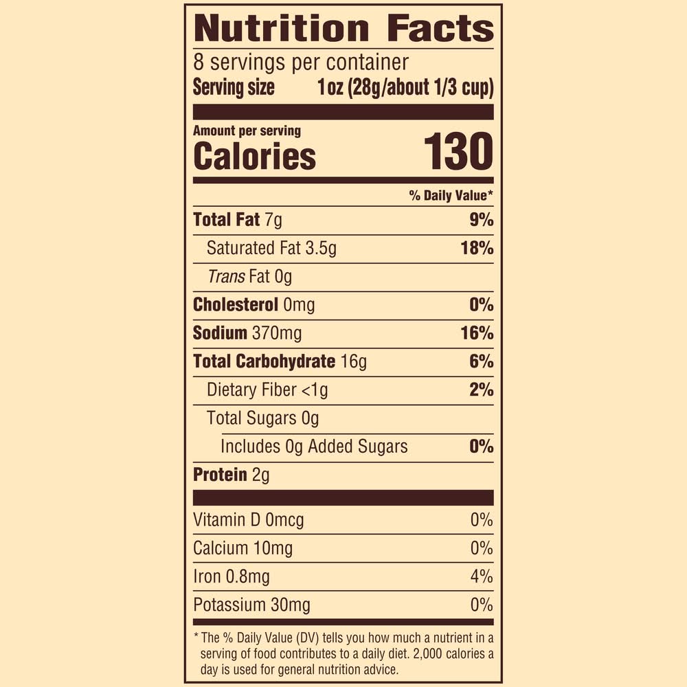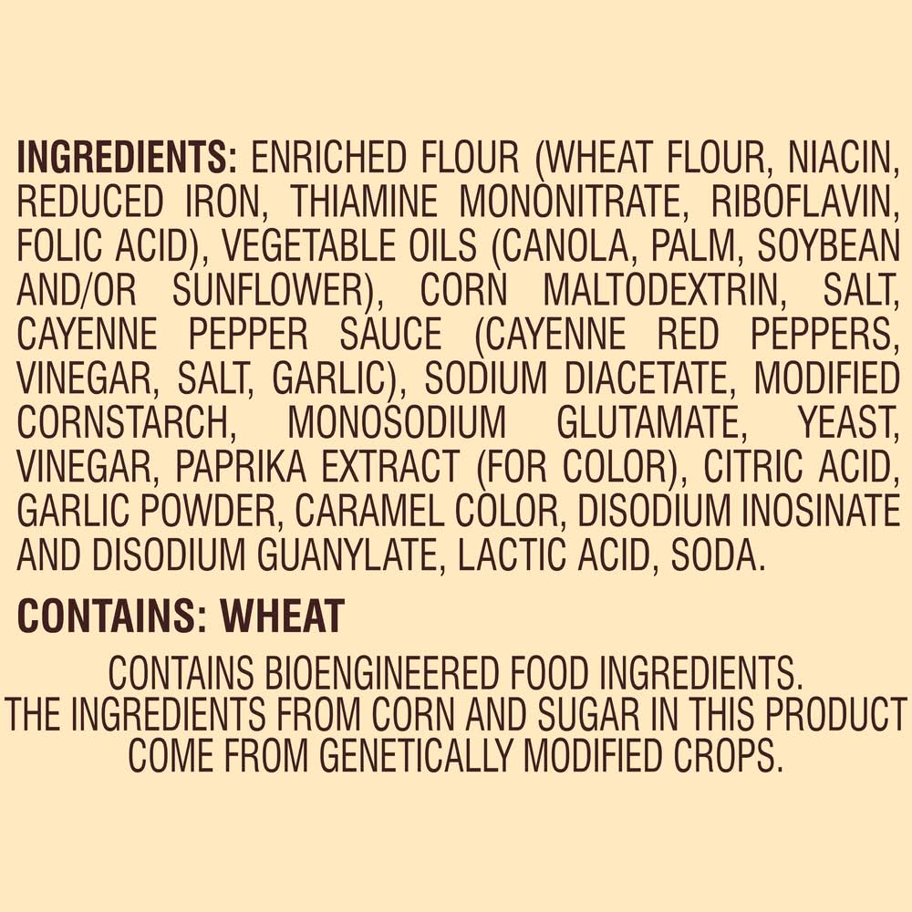 Ingredients: INGREDIENTS: ENRICHED FLOUR (WHEAT FLOUR, NIACIN, REDUCED IRON, THIAMINE MONONITRATE, RIBOFLAVIN, FOLIC ACID), VEGETABLE OILS (CANOLA, PALM, SOYBEAN AND/OR SUNFLOWER), CORN MALTODEXTRIN, SALT, CAYENNE PEPPER SAUCE (CAYENNE RED PEPPERS, VINEGAR, SALT, GARLIC), SODIUM DIACETATE, MODIFIED CORNSTARCH, MONOSODIUM GLUTAMATE, YEAST, VINEGAR, PAPRIKA EXTRACT (FOR COLOR), CITRIC ACID, GARLIC POWDER, CARAMEL COLOR, DISODIUM INOSINATE AND DISODIUM GUANYLATE, LACTIC ACID, SODA. CONTAINS: WHEAT Contains: CONTAINS: Gluten, Wheat