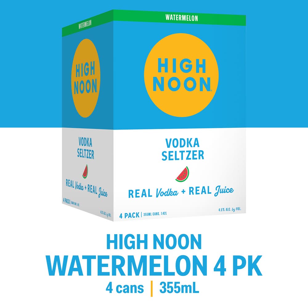 Sparkling water and natural flavors. Made with real juice. Vodka with real fruit juice. Real vodka and real juice. 100 calories. High noon sun sips are made with real vodka, real fruit juice, and sparkling water. The easy drinking, always socializing, great tasting, sun toasting, blue sky celebrating, memory making awesomeness in a can cocktail. Get out and enjoy. Try other flavors: black cherry, grapefruit, pineapple. • Flavor: Watermelon • Pack size: 4 • Alcohol by volume: 4.5% • High Noon Spirits Company, Memphis, TN