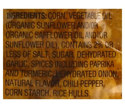 Ingredients: Corn, Vegetable Oil (Organic Sunflower and/or Organic Safflower Oil and/or Sunflower Oil), Contains 2% or Less of Salt, Sugar, Dehydrated Garlic, Spices Including Paprika and Turmeric, Dehydrated Onion, Natural Flavor Chili Pepper, Corn Starch, Rice Hulls