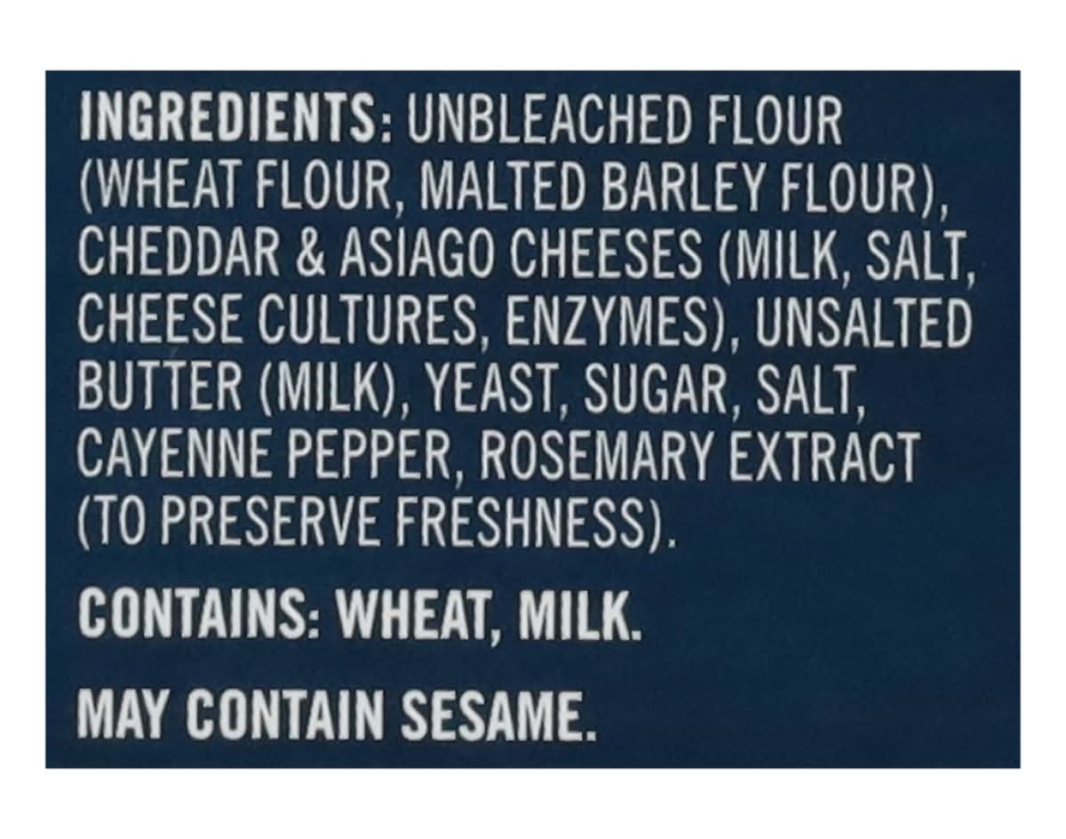 Ingredients: Unbleached Flour (Wheat Flour, Malted Barley Flour), Cheddar & Asiago Cheeses (Milk, Salt, Cheese Cultures, Enzymes), Unsalted Butter (Milk), Yeast, Sugar, Salt, Cayenne Pepper, Rosemary Extract (to Preserve Freshness) Contains: Wheat, Barley, Milk, Sesame