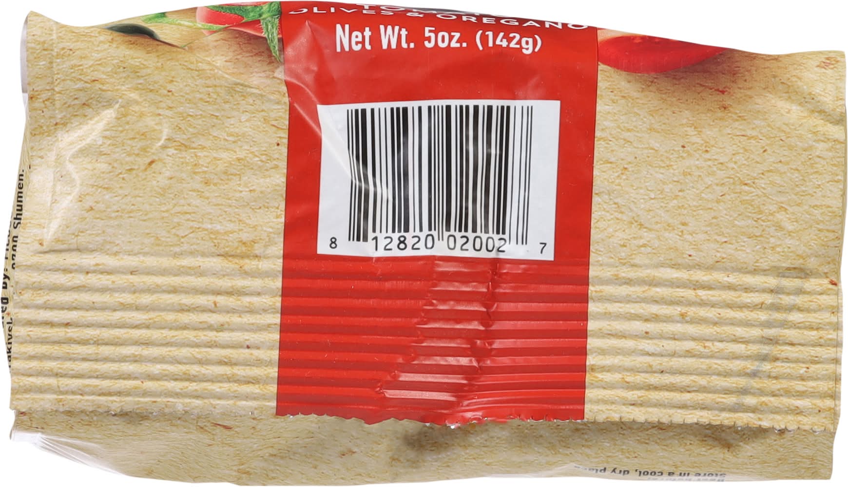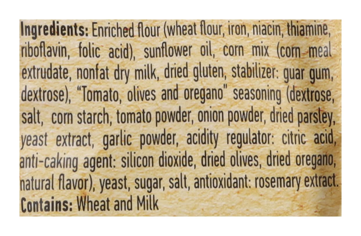 Ingredients: Enriched Flour (Wheat Flour, Iron, Niacin, Thiamine, Riboflavin, Folic Acid), Sunflower Oil, Corn Mix (Corn Meal Extrudate, Nonfat Dry Milk, Dried Gluten, Stabilizer: Guar Gum, Dextrose), Tomato, Olives and Oregano Seasoning (Dextrose, Salt, Corn Starch, Tomato Powder, Onion Powder, Dried Parsley, Yeast Extract, Garlic Powder, Acidity Regulator: Citric Acid, Anti-Caking Agent: Silicon Dioxide, Dried Olives, Dried Oregano, Natural Flavor), Yeast, Sugar, Salt, Antioxidant: Rosemary Extract Contains: Wheat, Milk, Gluten