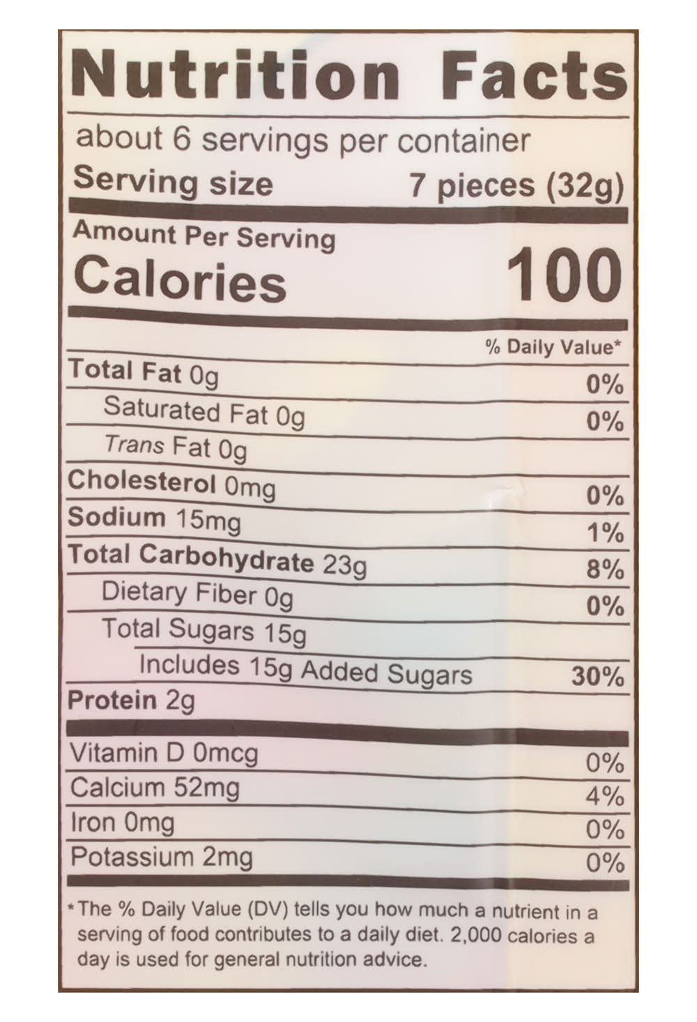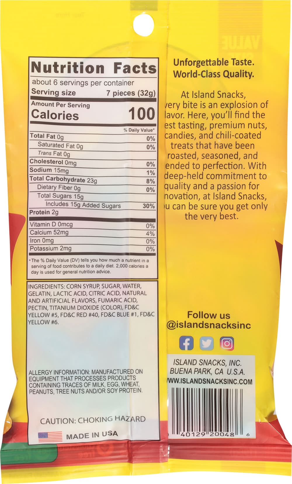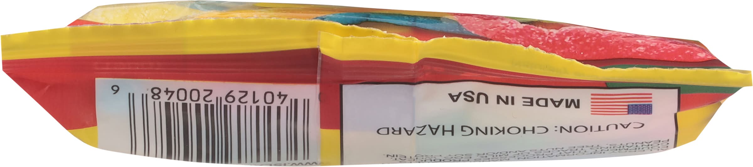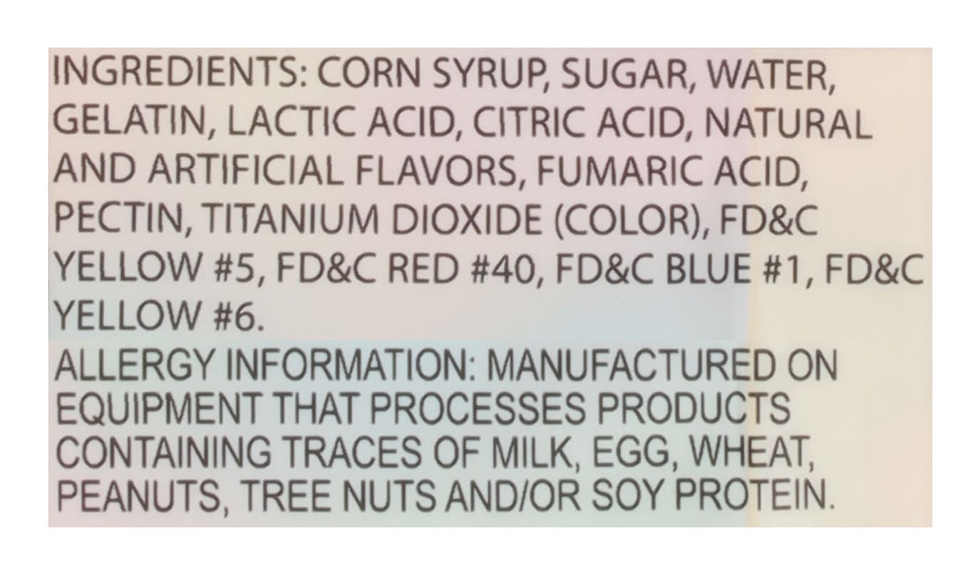 Ingredients: Corn Syrup, Sugar, Water, Gelatin, Lactic Acid, Citric Acid, Natural and Artificial Flavors, Fumaric Acid, Pectin, Titanium Dioxide (Color), FD&C Yellow #5, FD&C Red #40, FD&C Blue #1, FD&C Yellow #6 Contains: Corn, Milk, Eggs, Wheat, Peanuts, Tree Nuts, Soybeans