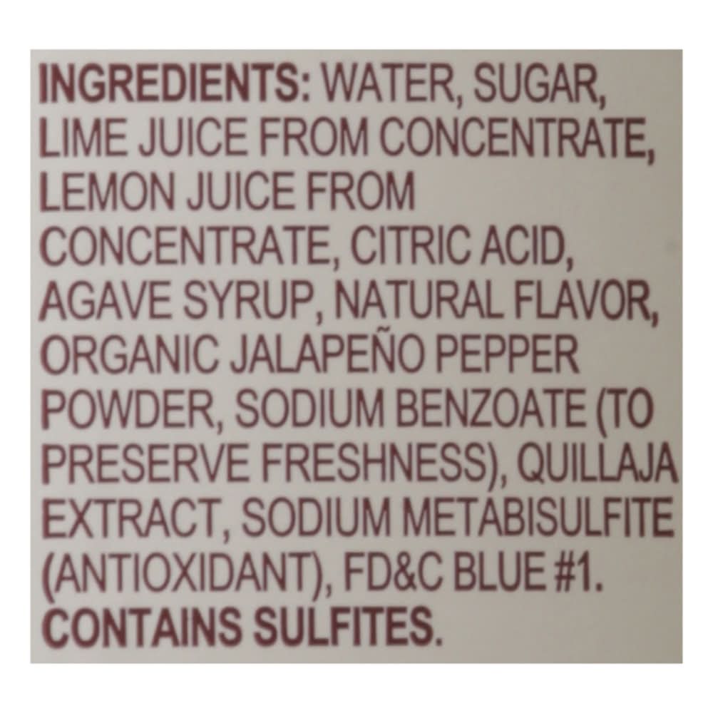 Ingredients: Water, Sugar, Lime Juice from Concentrate, Lemon Juice from Concentrate, Citric Acid, Agave Syrup, Natural Flavor, Organic Jalapeno Pepper Powder, Sodium Benzoate (to Preserve Freshness), Quillaia Extract, Sodium Metabisulfite (Antioxidants), FD&C Blue No.1 Contains: Sulfites