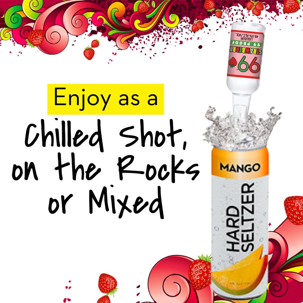 Liven up your experience with the exciting flavor of 99 Brand Strawberry Liqueur. With 27 cordials flavors and growing, 99 is America's 1 cordials brand. These liqueur shots are an amazing way to celebrate the good times and chill vibes. Each bottle of 99 Brand Strawberry liqueur drinks has zero sugar and 155 calories per 1.5 ounce shot. At 49.5% alcohol, 99 can be enjoyed straight out of the bottle as shots for a burst of tasty strawberry flavor. Perfect for any party or celebration with friends, 99 Strawberries tastes great in a multitude of spectacular alcoholic beverages, cocktails and mixed drinks. Add this liqueur to your hard seltzer for a full flavor explosion or combine this strawberry liqueur shot with other 99 Brand liqueurs, like 99 Bananas, to make a variety of delicious alcoholic beverages. Store 99 Strawberries at room temperature or pour it from your freezer for an icy shot. Please drink responsibly. Alcohol by volume: 49.5%