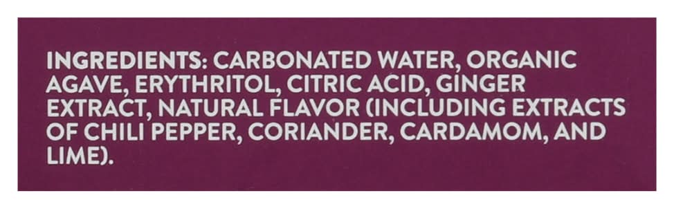 Ingredients: Carbonated Water, Organic Agave, Erythritol, Citric Acid, Ginger Extract, Natural Flavor Including Extracts of Chili Pepper, Coriander, Cardamom, and Lime.