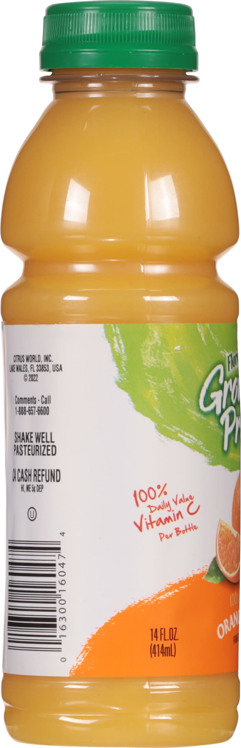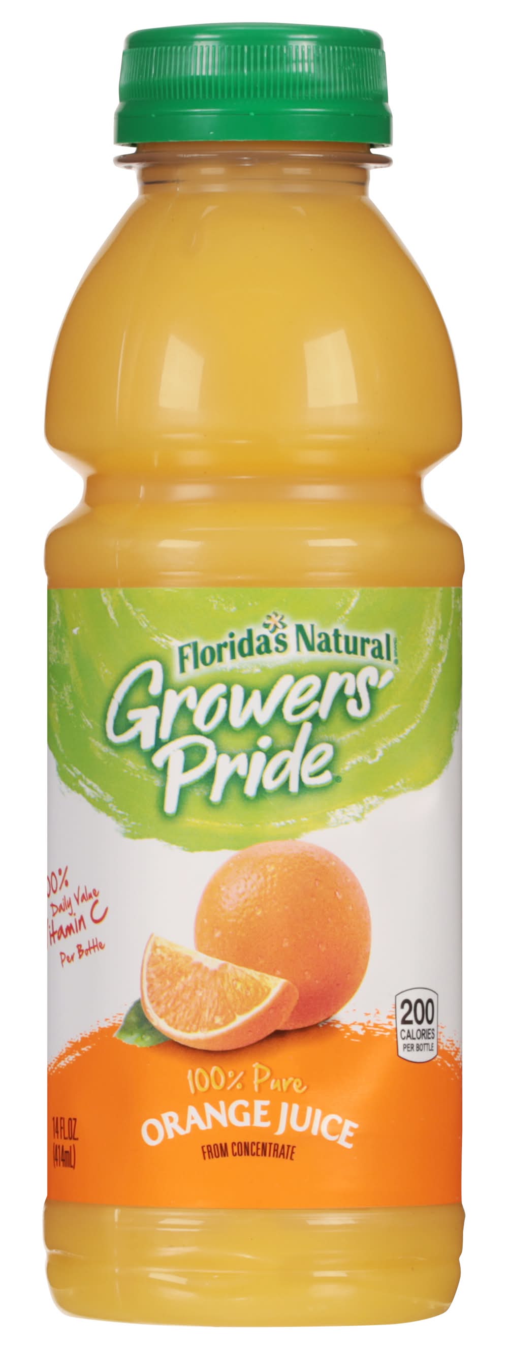 Florida's Natural Growers Pride Orange Juice is a 14oz bottled beverage that provides 220 calories and fulfills 100% of the daily value for vitamin C per bottle. The juice is pasteurized and features a blend of orange concentrate sourced from the USA, Brazil, Mexico, and Costa Rica. • Flavor: Orange • Number of servings: 1