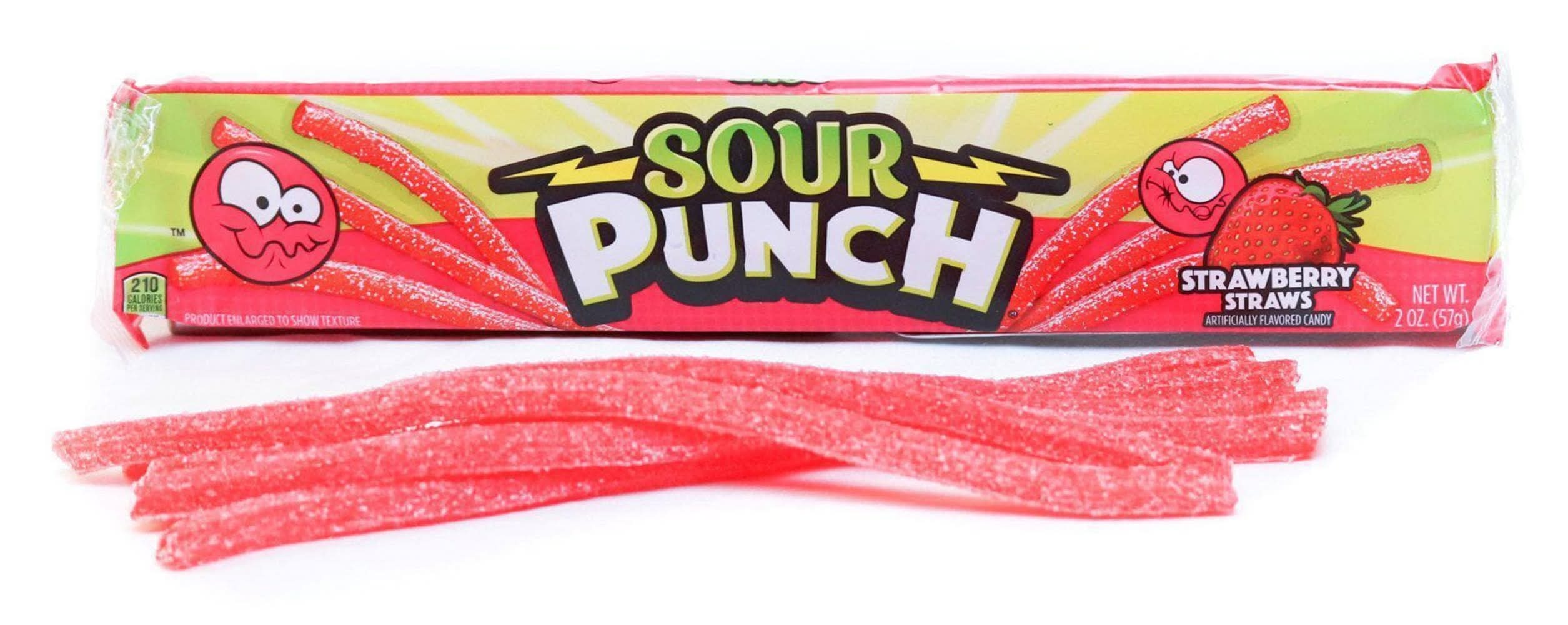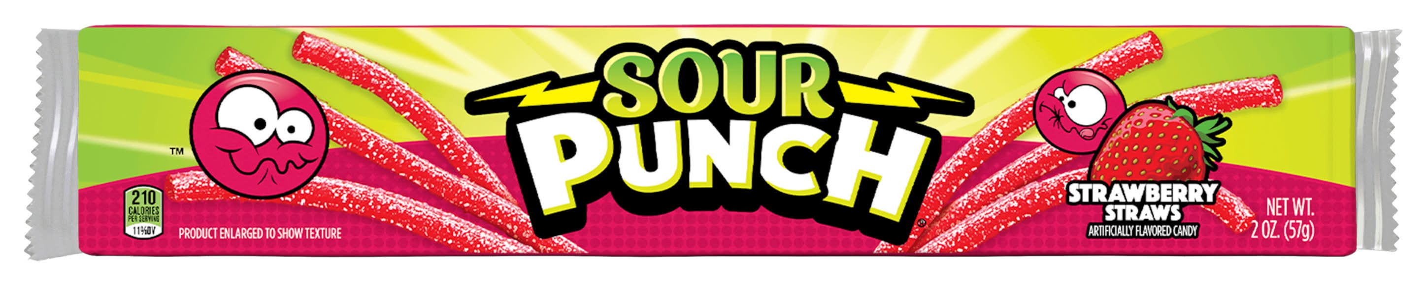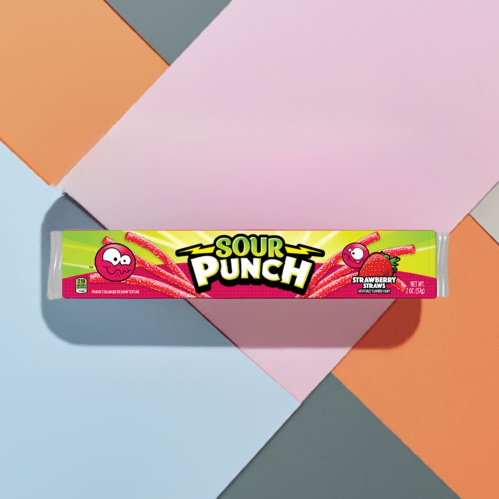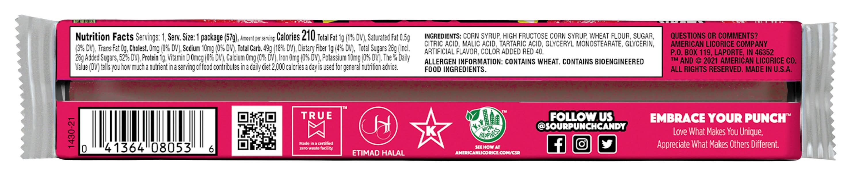 Sour Punch Strawberry Straws Candy offers a mouthwatering combination of sweet and sour in each chewy straw. Coated with a signature sour sugar, these candies aim to satisfy cravings for a tart treat. Sour Punch is available in a variety of shapes, sizes, and flavors, catering to diverse tastes and preferences. • Brand: Sour punch • American Licorice Company, PO Box 119, La Porte, IN, 46352