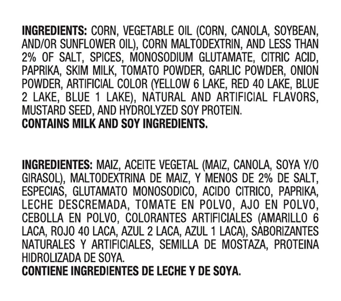 Ingredients: Corn, Vegetable Oil (Corn, Canola, Soybean, and/or Sunflower Oil), Corn Maltodextrin, and Less than 2% of Salt, Spices, Monosodium Glutamate, Citric Acid, Paprika, Skim Milk, Tomato Powder, Garlic Powder, Onion Powder, Artificial Color (Yellow 6 Lake, Red 40 Lake, Blue 2 Lake, Blue 1 Lake), Natural and Artificial Flavors, Mustard Seed, and Hydrolyzed Soy Protein Contains: Milk, Soybeans, Corn, Mustard