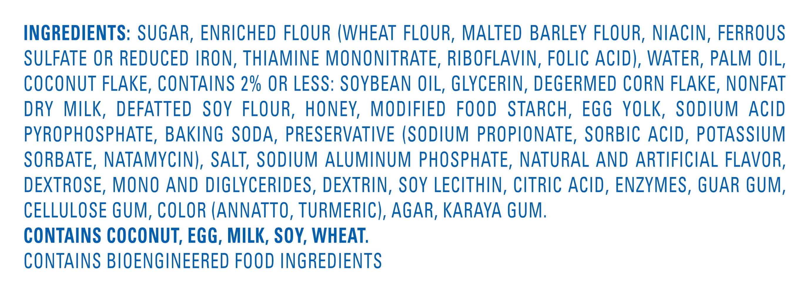 Ingredients: Sugar, Enriched Flour (Wheat Flour, Malted Barley Flour, Niacin, Ferrous Sulfate Or Reduced Iron, Thiamine Mononitrate, Riboflavin, Folic Acid), Water, Palm Oil, Coconut Flake, Contains 2% Or Less: Soybean Oil, Glycerin, Degermed Corn Flake, Nonfat Dry Milk, Defatted Soy Flour, Honey, Modified Food Starch, Egg Yolk, Sodium Acid Pyrophosphate, Baking Soda, Preservative (Sodium Propionate, Sorbic Acid, Potassium Sorbate, Natamycin), Salt, Sodium Aluminum Phosphate, Natural And Artificial Flavor, Dextrose, Mono And Diglycerides, Dextrin, Soy Lecithin, Citric Acid, Enzymes, Guar Gum, Cellulose Gum, Color (Annatto, Turmeric), Agar, Karaya Gum. Contains Coconut, Egg, Milk, Soy, Wheat. Contains Bioengineered Food Ingredients Contains: Contains Coconut, Egg, Milk, Soy, Wheat. Contains Bioengineered Food Ingredients.