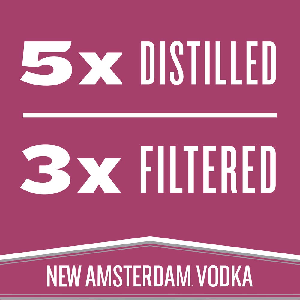 New Amsterdam Raspberry Flavored Vodka is five times distilled and three times filtered for a clean, crisp taste that's layered with bright notes of sweet raspberries. New Amsterdam raspberry vodka is smooth enough to drink straight or mixed in to your favorite vodka cocktails. New Amsterdam is committed to excellence and our flavored vodkas are crafted using our award winning original 80-proof vodka. • Brand: New amsterdam • Category: Flavored vodka • Alcohol by volume: 35% • Flavor: raspberry • Liquor color: clear