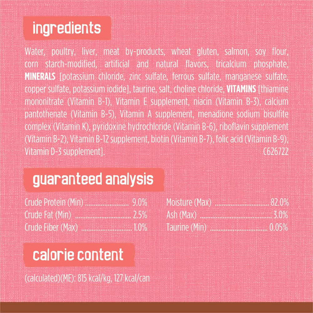 Ingredients: Water, Poultry Liver, Meat By-Products, Wheat, Gluten, Salmon, Soy, Flour on Starch-Modified, Artificial and Natural Flavors, Tricalcium Phosphate Minerals [Potassium Chloride Mono and Dicalcium Phosphate Zinc Sulfate Ferrous Sulfate, Copper Sulfate Manganese Sulfate Potassium Iodide], Added Color, Taurine, Salt, Choline, Chloride, Vitamins [Thiamine Mononitrate (Vitamin B-1) Vitamin E Supplement Niacin (Vitamin B-3), Calcium Pantothenate (Vitamin B-5) Vitamin A Supplement Menadione Sodium Bisulfite Complex (Vitamin K), Pyridoxine Hydrochloride (Vitamin B-6) Riboflavin Supplement (Vitamin B-2) Vitamin B-12 Supplement Biotin (Vitamin B-7), Folic Acid (Vitamin B-9) Vitamin D-3 Supplement], Red 3. B626718