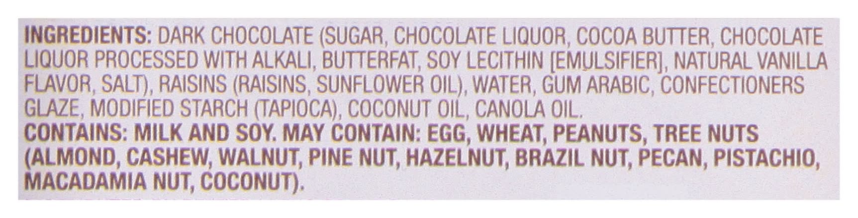 Ingredients: Dark Chocolate (Sugar, Chocolate Liquor, Cocoa Butter, Chocolate Liquor Processed with Alkali, Butterfat, Soy Lecithin [Emulsifier], Natural Vanilla Flavor, Salt), Raisins (Raisins, Sunflower Oil), Water, Gum Arabic, Confectioners Glaze, Modified Starch (Tapioca), Coconut Oil, Canola Oil. Contains: Milk, Soybeans, Tree Nuts, Eggs, Wheat, Peanuts, Tree Nuts