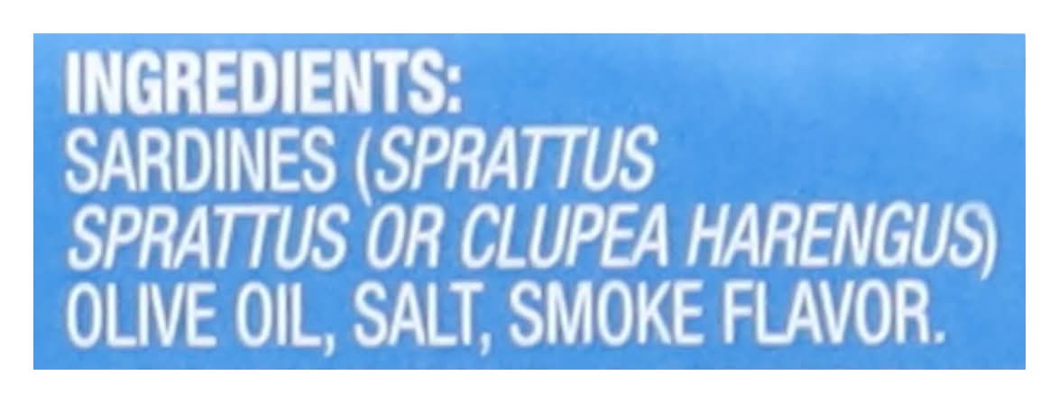 Ingredients: Sardines (Sprattus Sprattus or Clupea Harengus) Olive Oil, Salt, Smoke Flavor Contains: Fish, Sardines