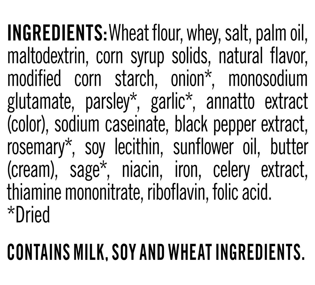 Ingredients: WHEAT Flour, Whey, Salt, Palm Oil, Maltodextrin, Corn Syrup Solids, Natural Flavor, Modified Corn Starch, Onion*, Monosodium Glutamate, Parsley*, Garlic*, Annatto Extract (Color), Sodium Caseinate, Black Pepper Extract, Rosemary*, SOY Lecithin, Sunflower Oil, Butter (Cream), Sage*, Niacin, Iron, CELERY Extract, Thiamine Mononitrate, Riboflavin, Folic Acid.*Dried. CONTAINS MILK Contains: Soybeans, Wheat, Celery, Corn
