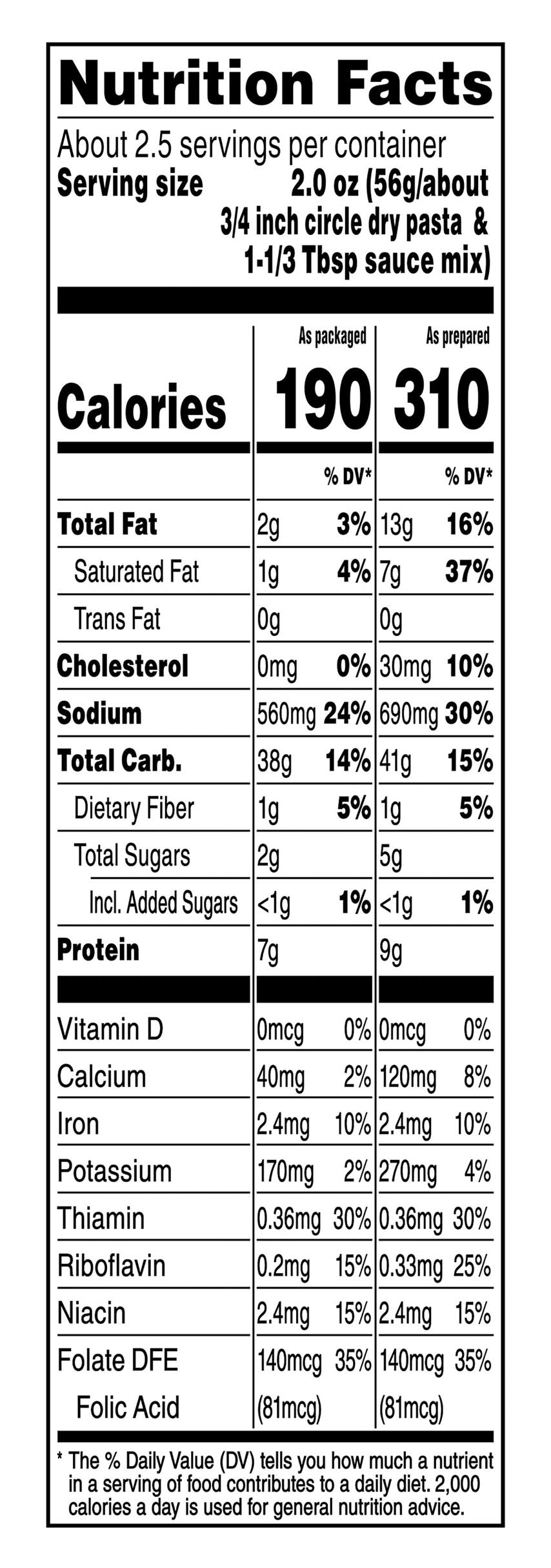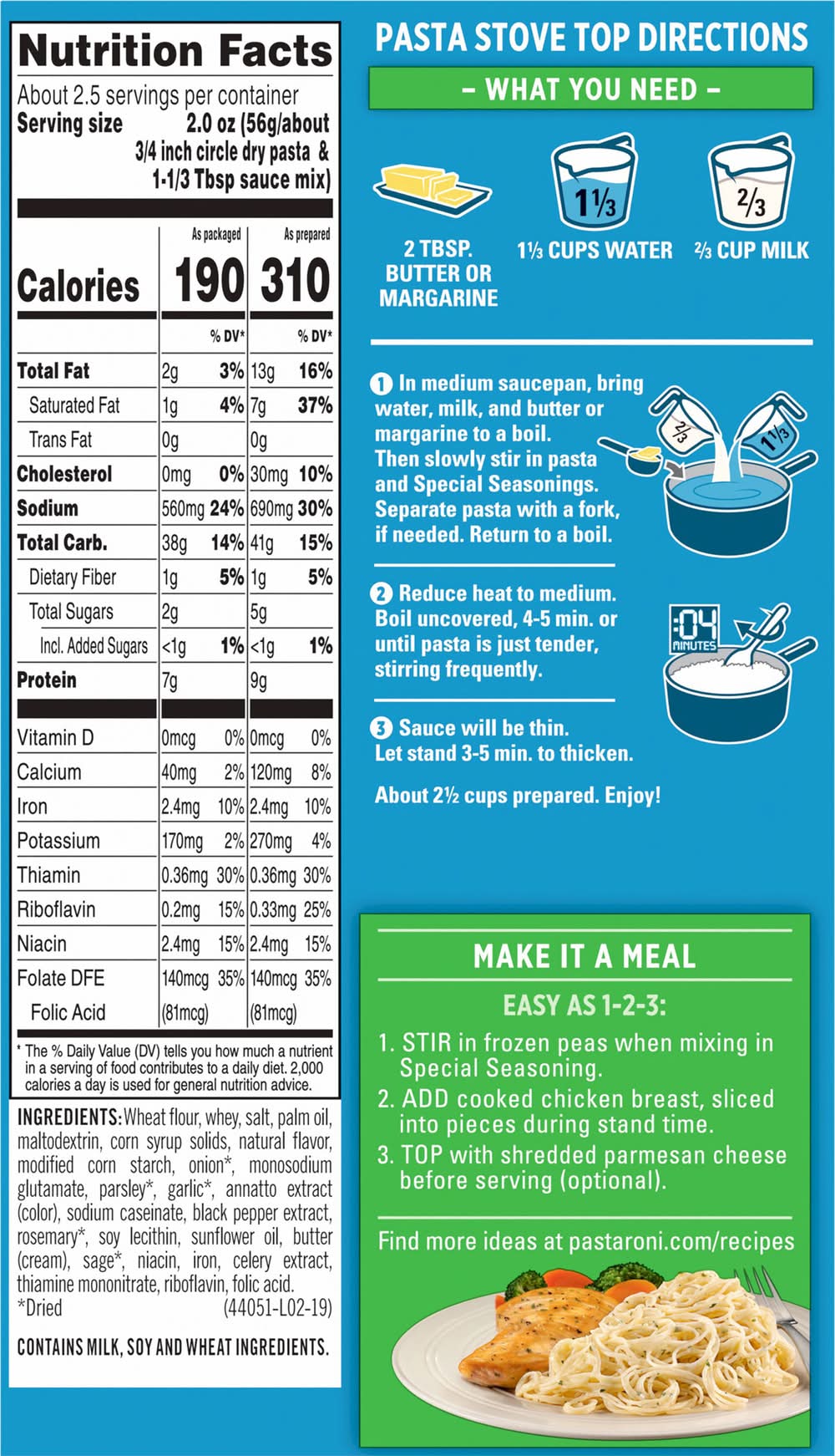 Safe handling instructions: this product is not ready-to-eat and must be thoroughly cooked before eating to prevent illness from potential bacteria in the product. do not eat or play with raw product; wash hands, utensils, and surfaces after handling. pasta stove top directions: what you need: 2 tbsp. butter or margarine. 1 1/3 cups water. 2/3 cup milk. 1. in medium saucepan, bring water, milk, and butter or margarine to a boil. then slowly stir in pasta and special seasonings. separate pasta with a fork, if needed. return to a boil. 2. reduce heat to medium. boil uncovered, 4-5 min. or until pasta is just tender, stirring frequently. 3. sauce will be thin. let stand 3-5 min. to thicken. about 2-1/2 cups prepared. enjoy! microwave directions: in 2-quart microwaveable bowl, combine 1 1/3 cups water, 2/3 cup milk, and 2 tablespoons of butter or margarine. stir. microwave uncovered at high 4-5 minutes or until boiling. slowly stir in pasta and special seasonings. microwave at high 1 minute. stir. microwave at high 3-4 minutes. sauce will be thin. let stand 3-5 minutes to thicken. microwave ovens vary; adjust times as needed. less fat directions: follow stove top or microwave direction, except replace butter with 1-1/2 teaspoons olive oil and use 3/4 cup skim milk. fat reduced to 5g from 13g per serving. saturated fat reduced to 1.5 g from 3.5 g per serving. trans fat reduced to 0 g from 1.5 g per serving. see nutrition facts panel for sodium content. make it a meal: easy 1-2-3: 1. stir in frozen peas when mixing in special seasoning. 2. add cooked chicken breast, sliced into pieces during stand time. 3. top with shredded parmesan cheese before serving (optional).