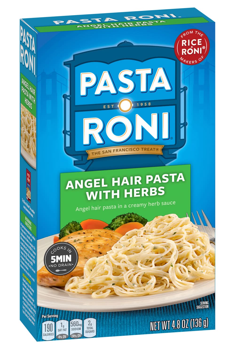 Angel Hair Pasta, with Herbs • Flavor: Creamy herb sauce • Golden Grain Co., PO Box 049003,Chicago, IL, USA • Packaging: Reusable