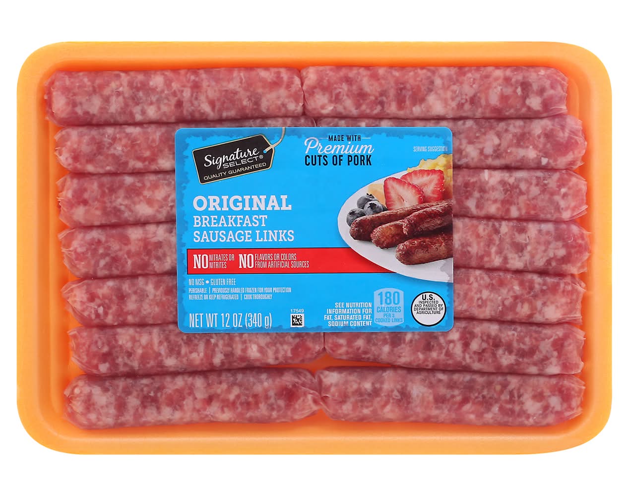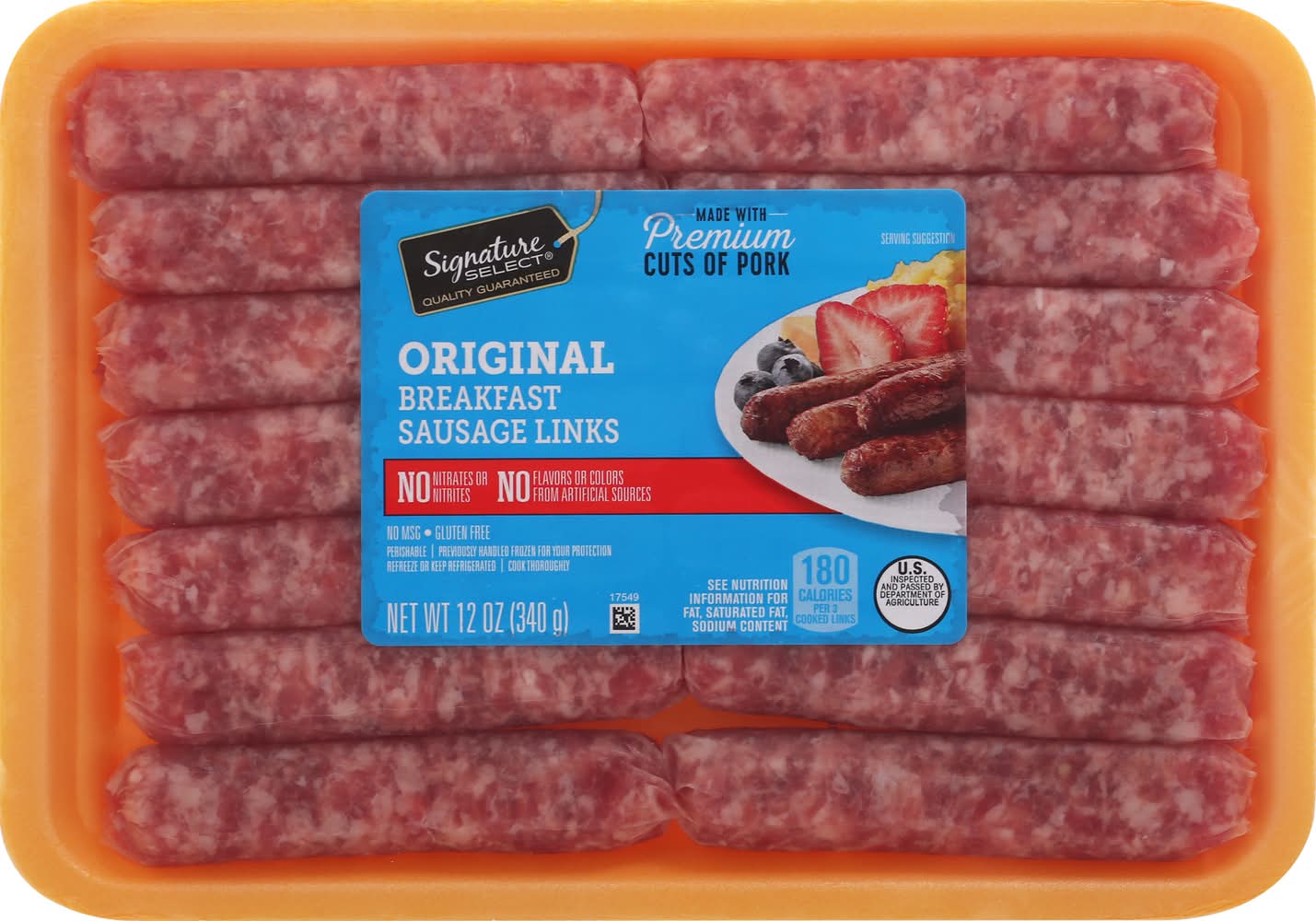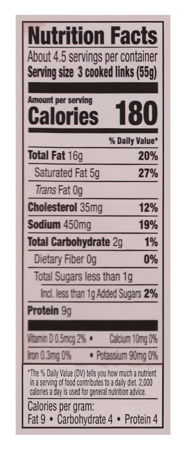 No flavors or colors from artificial sources. 180 calories per 3 cooked links. Gluten free. No MSG. No nitrates or nitrites. See nutrition information for fat, saturated fat, sodium content. Est. 1647. Cook thoroughly. Quality guaranteed. Our Promise, Quality& satisfaction 100% guarantee or your money back. U.S. inspected and passed by Department of Agriculture. • Number of servings: 4 • Packaging: Reusable