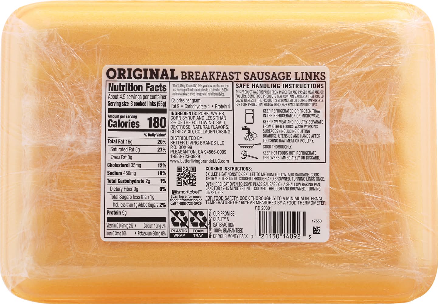 Directions for use: Safe Handling Instructions: This product was prepared from inspected and passed meat and/or poultry. Some food products may contain bacteria that could cause illness if the product is mishandled or cooked improperly. For your protection, follow these safe handling instructions. Keep refrigerated or frozen. Thaw in the refrigerator or microwave. Keep raw meat and poultry separate from other foods. Wash working surfaces (including cutting boards), utensils, and hands after touching raw meat or poultry. Cook thoroughly. Keep hot foods hot. Refrigerate leftovers immediately or discard. Cooking Instructions: Skillet: Heat nonstick skillet to medium to low. Add sausage. Cook 12-16 minutes until cooked through and browned, turning links once. Oven: Preheat oven to 350 degrees F. Place sausage on a shallow baking pan. Bake for 12-15 minutes until cooked through and browned, turning links once. For food safety, cook thoroughly to a minimum internal temperature of 160 degrees F as measured by a food thermometer. Perishable. Previously handled frozen for you protection. Refreeze or keep refrigerated. Storage recommendation: Perishable. Previously handled frozen for you protection. Refreeze or keep refrigerated.