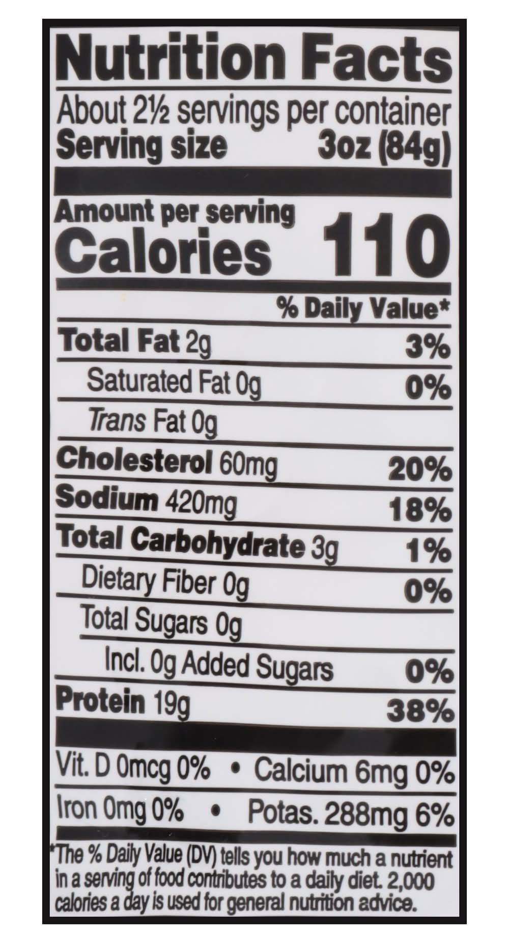 Ingredients: Boneless, Skinless Chicken Breast, Water, Contains Less than 2% of: Citrus Extract, Dextrose, Garlic Powder, Onion Powder, Potato Starch, Salt, Spices, Vinegar, and Yeast Extract
