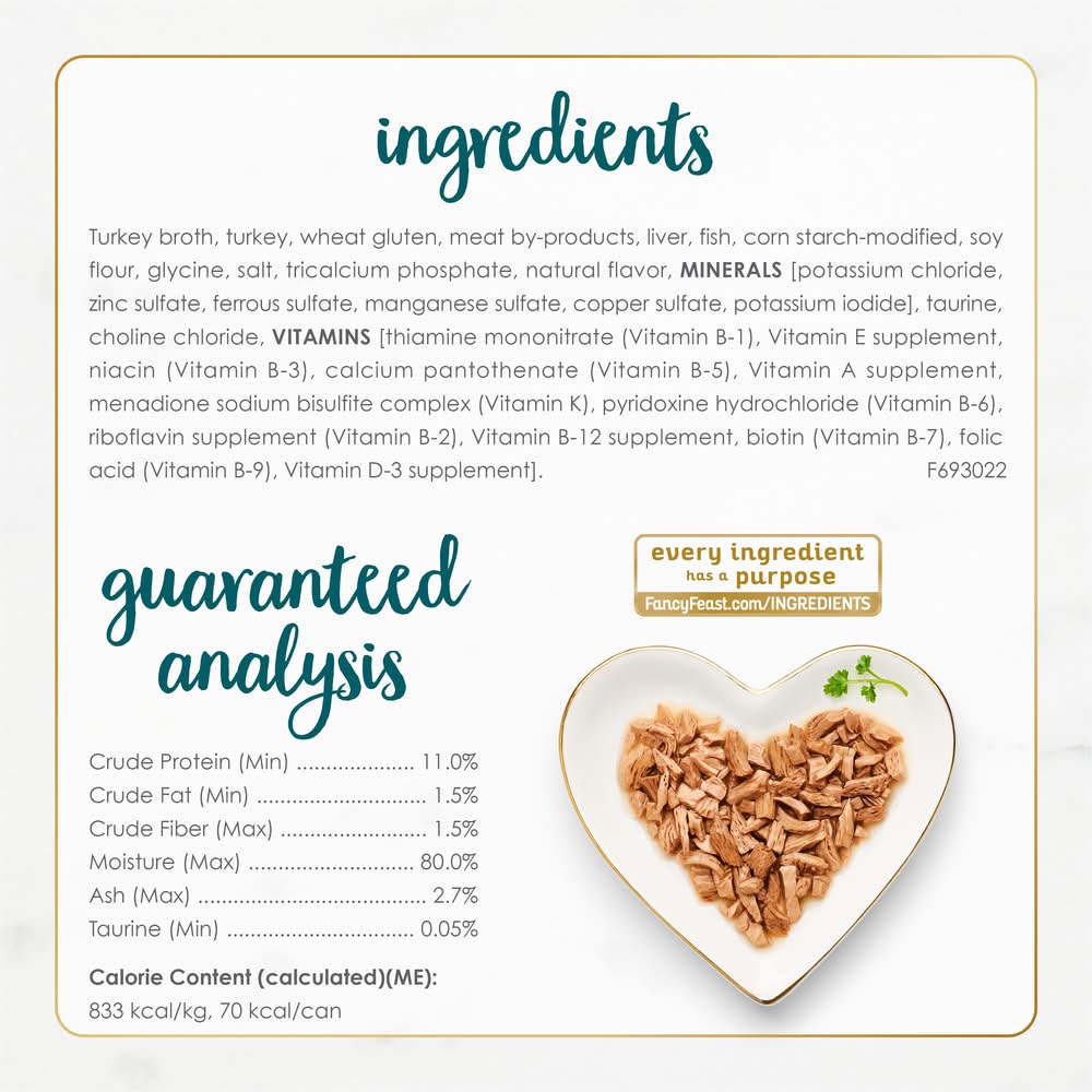 Ingredients: Turkey Broth Turkey Liver Wheat Gluten Meat By-Products Corn Starch-Modified Soy Flour Glycine Salt, Tricalcium Phosphate Natural Flavors Minerals [Potassium Chloride, Zinc Sulfate, Ferrous Sulfate, Manganese Sulfate, Copper Sulfate, Potassium Iodide], Taurine Choline Chloride Vitamins [Thiamine Mononitrate, Vitamin E Supplement, Niacin, Calcium Pantothenate, Vitamin A Supplement,, Menadione Sodium Bisulfite Complex, Pyridoxine Hydrochloride, Riboflavin Supplement, Vitamin B-12 Supplement, Biotin, Folic Acid, Vitamin D-3 Supplement]. F693021.