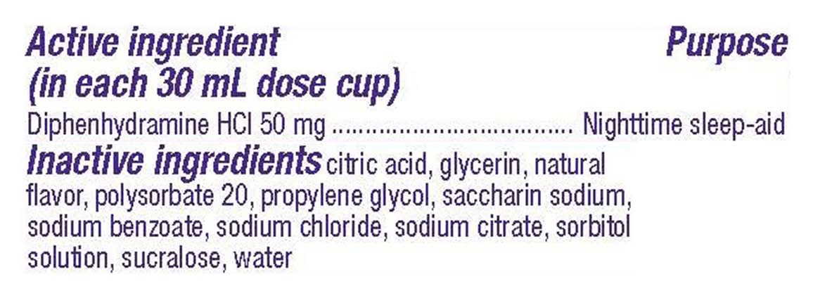 Ingredients: (in each 30 mL dose cup) Active Ingredients: Diphenhydramine HCl (50 mg), Nighttime Sleep-Aid. Inactive Ingredients: Citric Acid, Glycerin, Natural Flavor, Polysorbate 20, Propylene Glycol, Saccharin Sodium, Sodium Benzoate, Sodium Chloride, Sodium Citrate, Sorbitol Solution, Sucralose, Water Additives: Citric Acid Glycerin Natural Flavor, Polysorbate 20 Propylene Glycol Saccharin Sodium, Sodium Benzoate Sodium Chloride Sodium Citrate, Sorbitol Solution Sucralose Water.