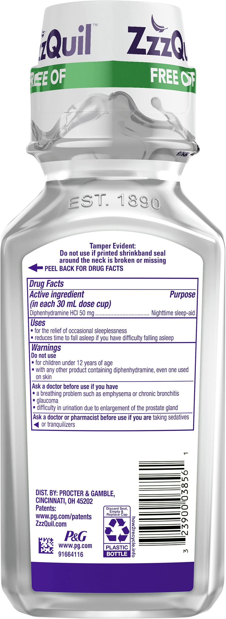 In each 30 ml dose cup: warnings: do not use: for children under 12 years of age; with any other product containing diphenhydramine, even one used on skin. ask a doctor before use if you have: a breathing problem such as emphysema or chronic bronchitis; glaucoma; difficulty in urination due to enlargement of the prostate gland. ask a doctor or pharmacist before use if you are taking sedatives or tranquilizers. when using this product: avoid alcoholic beverages. stop use and ask a doctor if sleeplessness persists continuously for more than 2 weeks. insomnia may be a symptom of serious underlying medical illness. if pregnant or breast-feeding, ask a health professional before use. keep out of reach if children. in case of overdose, get medical help or contact a poison control center right away. tamper evident: do not use if printed shrinkband seal around the neck is broken or missing.