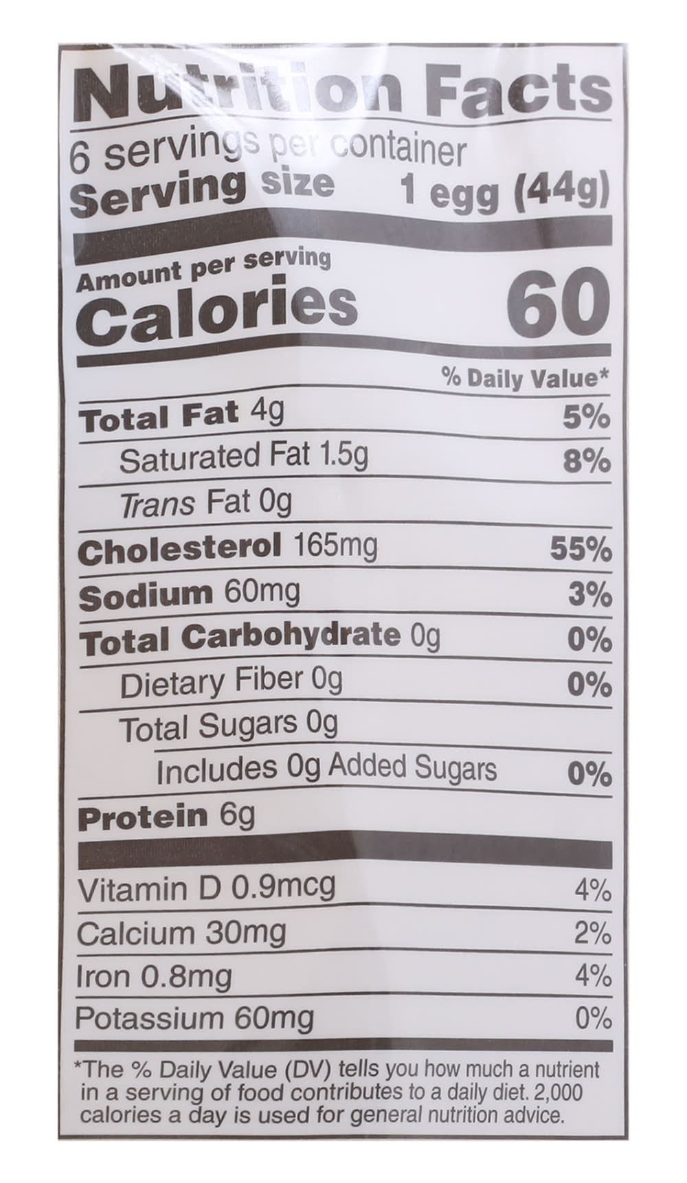 These eggs are ensuring they meet strict organic farming standards. The eggs are sourced from cage-free hens raised with shelter, resting areas, sufficient space, and the ability to engage in natural behaviors, aligning with the Humane Farm Animal Care Program standards. This product is not classified as low calorie and is derived from non-GMO ingredients as part of its organic certification. • Number of servings: 6 • Lucerne Foods, Pleasanton, CA, 94566-0009 • Packaging: Reusable