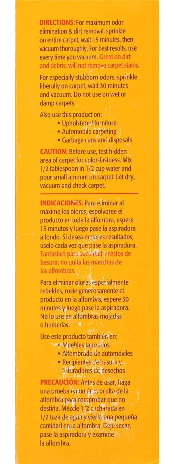 For maximum odor elimination & dirt removal, sprinkle on entire carpet, wait 15 minutes, then vacuum thoroughly. for best results, use every time your vacuum. great on dirt and debris, will not remove carpet stains. for especially stubborn odors, sprinkle liberally carpet, wait 30 minutes and vacuum. do not use on wet or damp carpets. also use this product on: upholstered furniture; automobile carpeting; garbage cans and disposals.