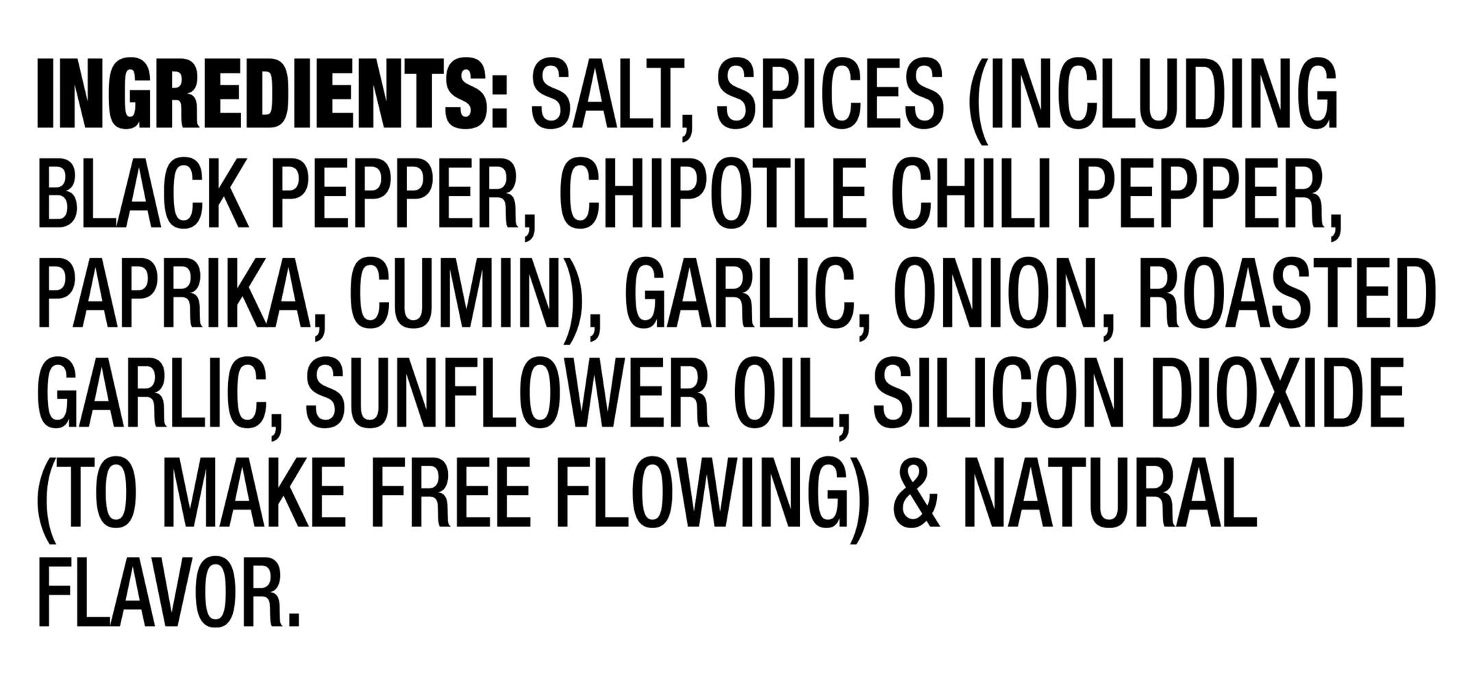 Ingredients: Salt, Spices (Including Black Pepper, Chipotle Chili Pepper, Paprika, Cumin), Garlic, Onion, Roasted Garlic, Sunflower Oil, Annatto, Silicon Dioxide (to Make Free Flowing) and Natural Flavor.