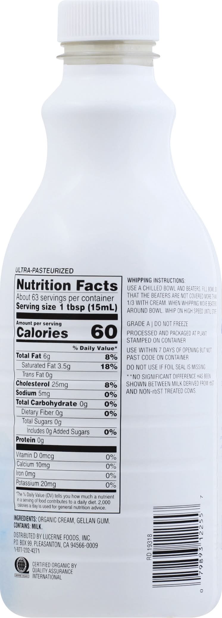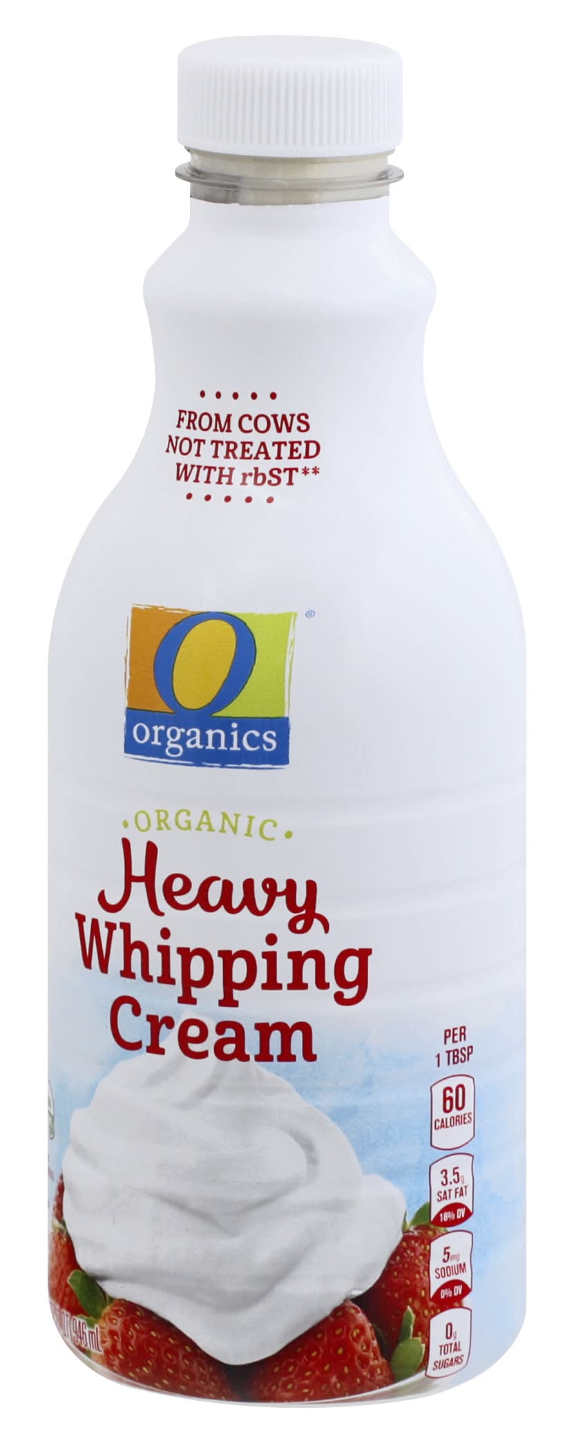 Per 1 Tbsp: 60 calories; 3.5 g sat fat (18% DV); 5 mg sodium (0% DV); 0 g total sugars. USDA Organic. Certified Organic by Quality Assurance International. From cows not treated with rbST (No significant difference has been shown between milk derived from rbST and non-rbST treated cows). Processed and packaged at plant stamped on container. Ultra-pasteurized. Organic from the source. Doesn't it feel good to know where your food comes from? At O Organics we carefully select ingredients which meet organic farming standards and share our commitment to organic agriculture. 100% guaranteed quality & satisfaction or your money back. Grade A. SmartLabel: Scan for more food information. • Number of servings: 63 • Lucerne Foods, Pleasanton, CA, 94566-0009, Ph: 877-232-4271 • Packaging: Reusable