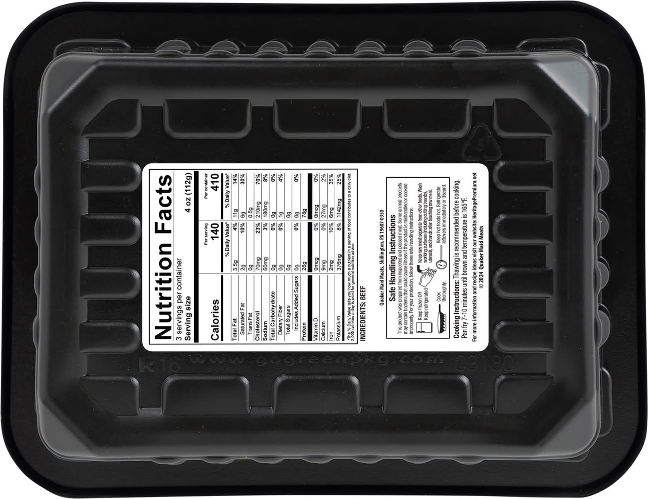 Since 1960. Heritage - A family legacy of premium quality. 100% US beef. US Inspected and passed by Department of Agriculture. Quality control USDA approved. Quaker Maid Meats, Shillington, PA, 19607-0358