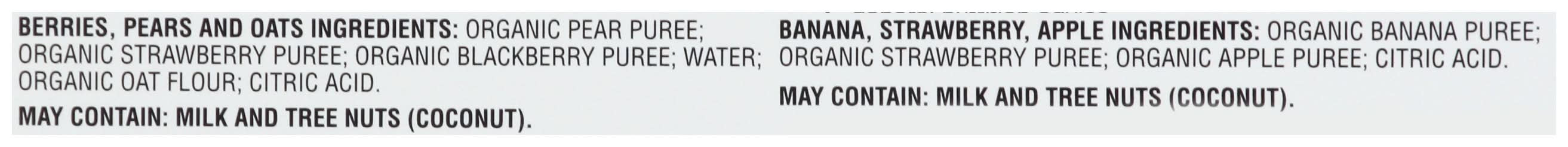Ingredients: Berries, Pears and Oats Ingredients: Organic Pear Puree; Organic Strawberry Puree; Organic Blackberry Puree; Water; Organic Oat Flour; Citric Acid. Banana; Strawberry. Apple Ingredients: Organic Banana Puree; Organic Strawberry Puree; Organic Apple Puree; Citric Acid. Contains: Tree Nuts, Milk