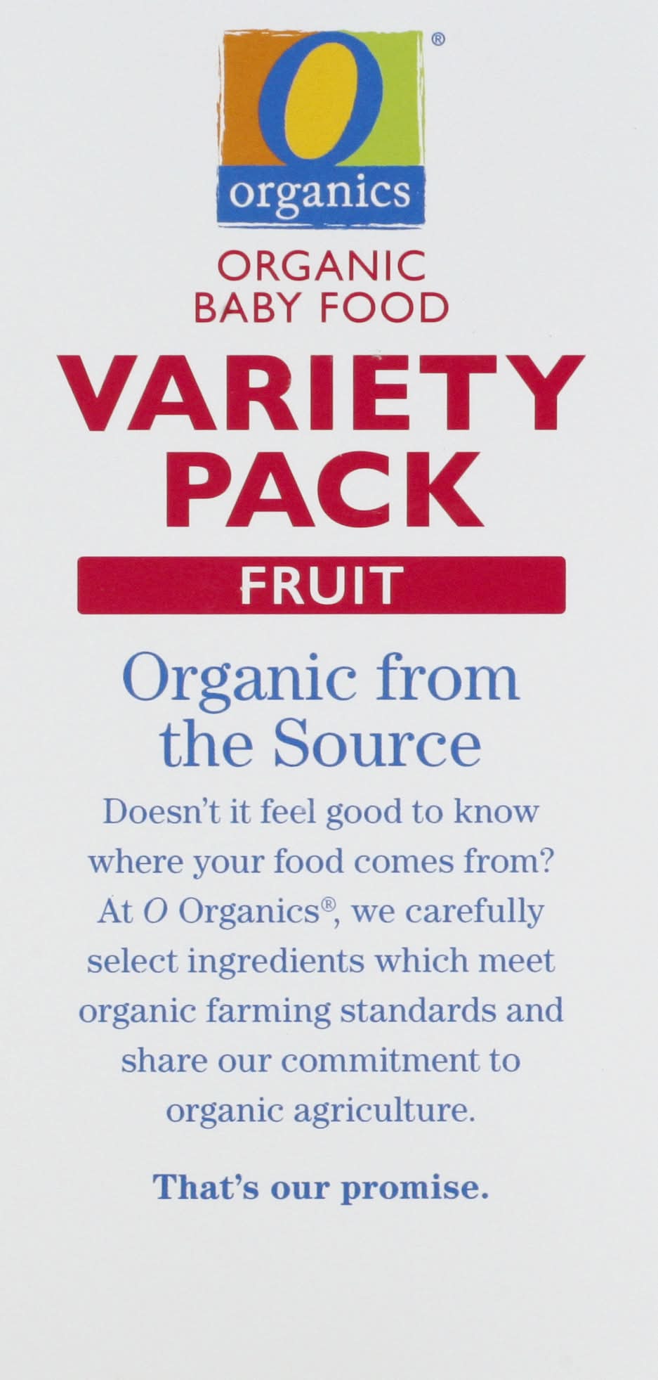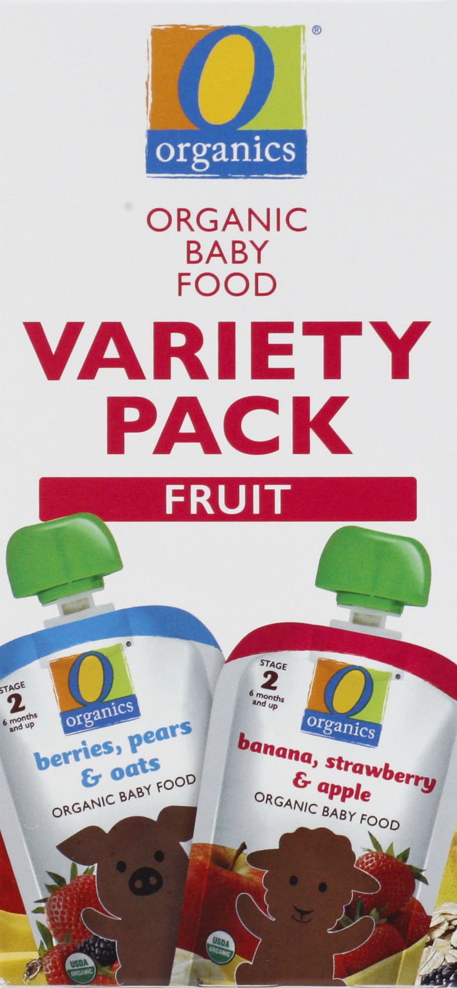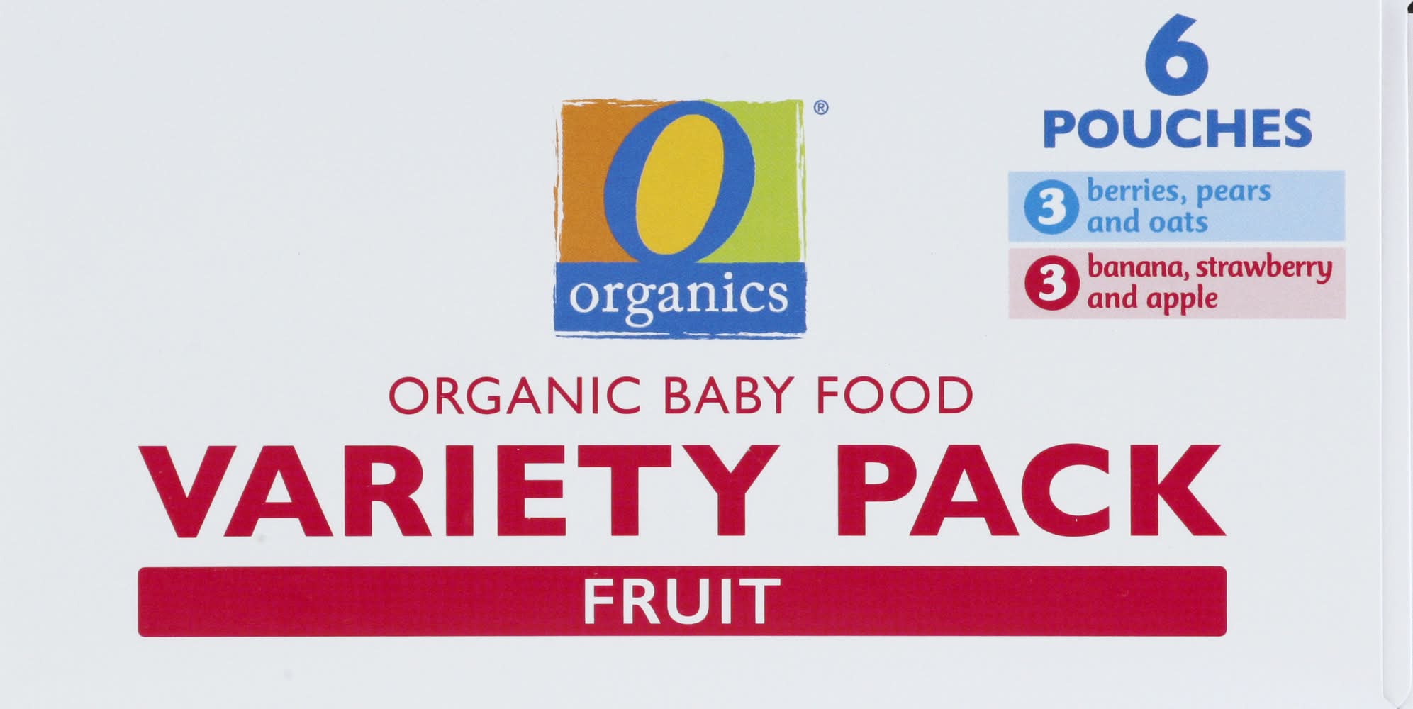 3 berries, pears and oats. 3 banana, strawberry and apple. Berries Pears Oat: 70 calories per 1 pouch. Banana Strawberry Apple: 90 calories per 1 pouch. USDA Organic. Certified Organic by Quality Assurance International. Organic from the Source: Doesn't if feel good to know where your food comes from? A O Organics, we carefully select ingredients which meet organic farming standards and share our commitments to organic agriculture. That's our promise. 100% guaranteed. Quality & satisfaction or your money back. SmartLabel: Scan for more food information. • Flavor: Assorted • Pack size: 6 • Number of servings: 3 • Lucerne Foods, Pleasanton, CA, 94566-0009
