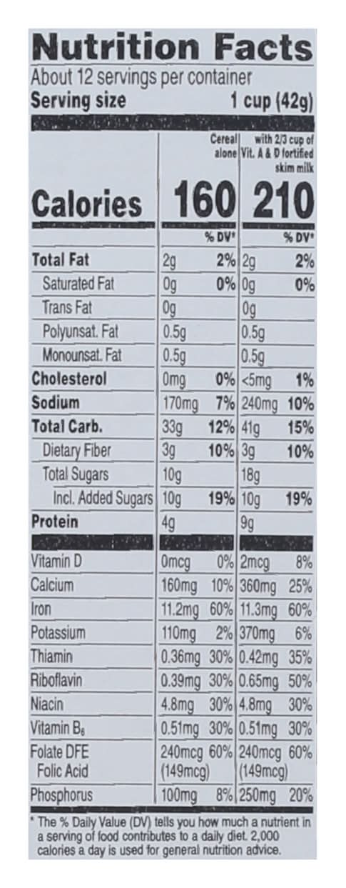 Ingredients: Sugar, Corn Flour, Calcium Carbonate, Salt, Cinnamon, Baking Soda, Caramel Color, Reduced Iron, Natural Flavor, Thiamine Mononitrate*, Pyridoxine Hydrochloride*, Riboflavin, Folic Acid, Tocopherols, To Preserve Freshness, Niacinamide, Annatto Color, Whole Wheat Flour, Whole Grain Oat Flour Contains: Wheat