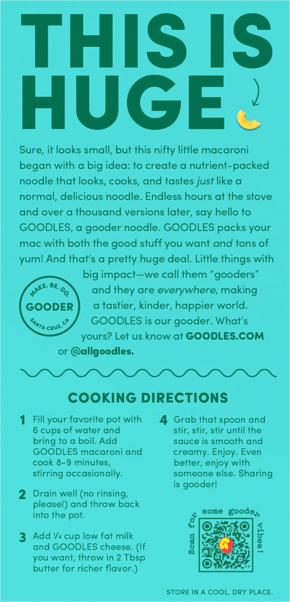 Creamy cheddar and macaroni. Noodles, gooder. This is huge. Sure, it looks small, but this nifty little macaroni began with a big idea: to create a nutrient-packed noodle that looks, cooks, and tastes just like a normal, delicious noodle. Endless hours at the stove and over a thousand versions later, say hello to Goodles, a gooder noodle. Goodles packs your mac with both the good stuff you want and tons of yum. And that's a pretty huge deal. Little things with big impact - we call them gooders and they are everywhere, making a tastier, kinder, happier world. Goodles is our gooder. Unbelievably delicious; Community love. Scan for some gooder vibes. Purity Award: Clean label project. Please recycle for a gooder planet. • Flavor: Creamy cheddar & macaroni • Gooder Foods Inc., 415 River St Suite A, Santa Cruz, CA 95060 • Packaging: Reusable