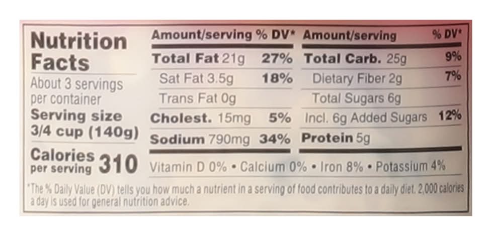 Ingredients: Cooked Macaroni (Semolina Wheat Flour [Enriched with Niacin, Iron, Thiamine Mononitrate Riboflavin, Folic Acid], Egg White), Mayonnaise (Soybean Oil, Water, Egg Yolks, Vinegar Salt) Sweet Pickle Relish (Cucumber, Sugar, Distilled Vinegar, Salt, Calcium Chloride, Mustard Seed, Xanthan Gum, Celery Seed, Dehydrated Red Bell Pepper, Natural Flavors, Turmeric, Minced Onion), Water, Celery, Sugar Onica Red Bell Pepper, Salt Vinegar, Mustard (Water, Vinegar, Mustard Seed, Salt, Sugar, Turmeric, Paprika, Garlic Powder Spices, Xanthan Gum, Annatto Extract Color Natural Flavor, Modified Corn Starch, Sodium Benzoate (Preservative), Potassium Sorbate (Preservative), Annatto Extract (Color) Xanthan Gum Contains: Wheat, Eggs, Soybeans, Mustard, Celery, Corn
