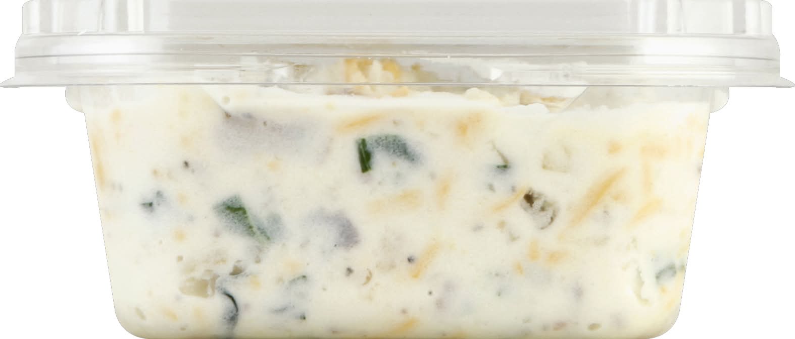 Ingredients: Russet Potatoes, Sour Cream (Milk, Cream, Sugar, Whey, Modified Corn Starch, Sodium Phosphate, Guar Gum, Carrageenan, Sodium Citrate, Locust Bean Gum, Cultures, Potassium Sorbate [Preservative]), Mayonnaise (Soybean Oil, Water, Egg Yolks, Vinegar, Salt), Cheddar Cheese (Cultured Milk, Salt, Enzymes, Annatto Color), Green Onion, Bacon Bits (Cured with Water, Salt, Sugar, Sodium Phosphate, Sodium Erythorbate, Sodium Nitrite), Vinegar, Water, Salt, Modified Corn Starch, Garlic Powder, Black Pepper, Potassium Sorbate (Preservative), Sodium Benzoate (Preservative) Contains: Milk, Eggs, Soybeans